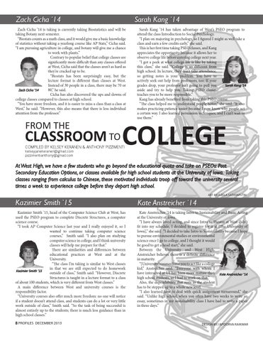 Zach Cicha ’14 is taking is currently taking Biostatistics and will be taking Botany next semester. “Biostats counts as a math class, and it would give me a basic knowledge of statistics without taking a yearlong course like AP Stats,” Cicha said. “I am pursuing agriculture in college, and botany will give me a chance to work with plants.” Contrary to popular belief that college classes are significantly more difficult than any classes offered at West, Cicha said that the classes aren’t as hard as they’re cracked up to be. “Biostats has been surprisingly easy, but the lecture format is different than classes at West. Instead of 30 people in a class, there may be 70 or Zach Cicha ’14 80,” he said. Cicha has also discovered the ups and downs of college classes compared to classes at high school. “You have more freedom, and it is easier to miss a class than a class at West,” he said. “However, this also means that there is less individual attention from the professor.”