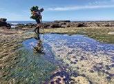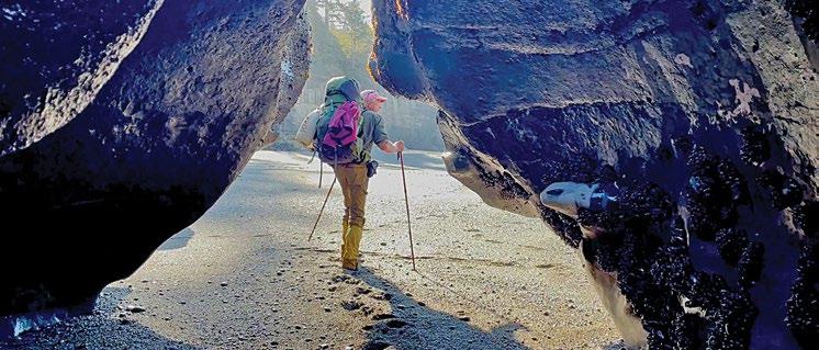 rock flats – hiking highways – are our favourite. At low tide these flats are tens of metres wide, mudstone and sandstone beveled flat by storm waves. Speckled everywhere are tide pool aquaria, filled with crystalclear water, sea grass, sea stars, urchins, and a nervous scatter of tiny shore crabs. Out on the open rock flats, these shore crabs scatter ahead of us as we hike, like a bow wake.
