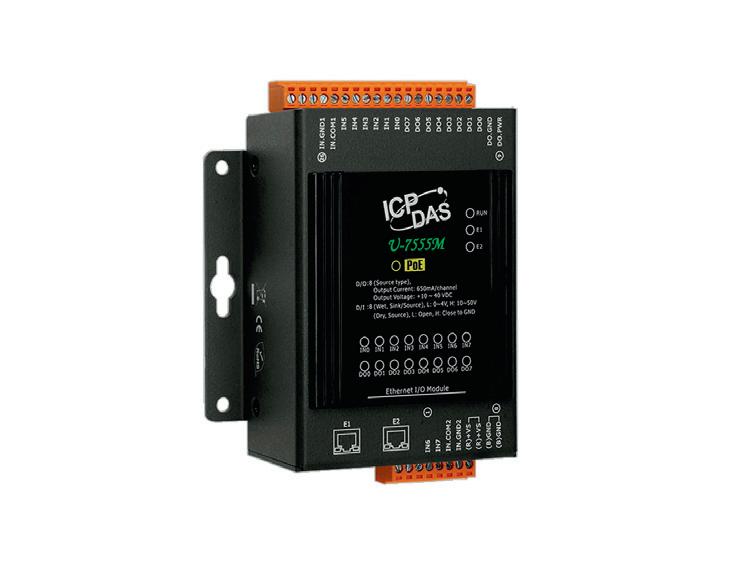 The ICP DAS U-7555M is an OPC UA I/O module that provides eight digital input channels and eight digital output channels. It also has a built-in dual-port Ethernet switch to implement a daisy-chain topology.