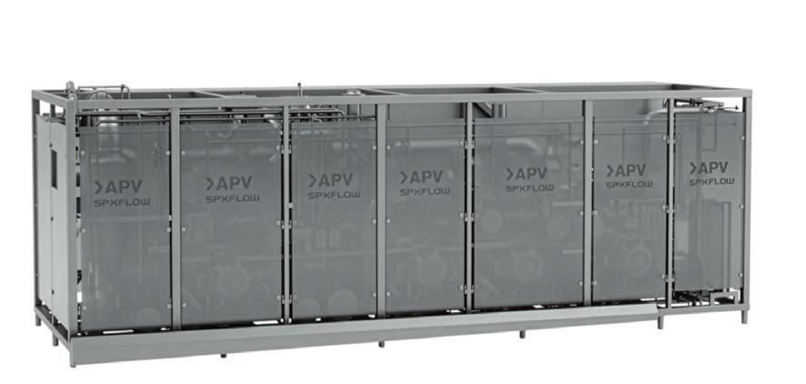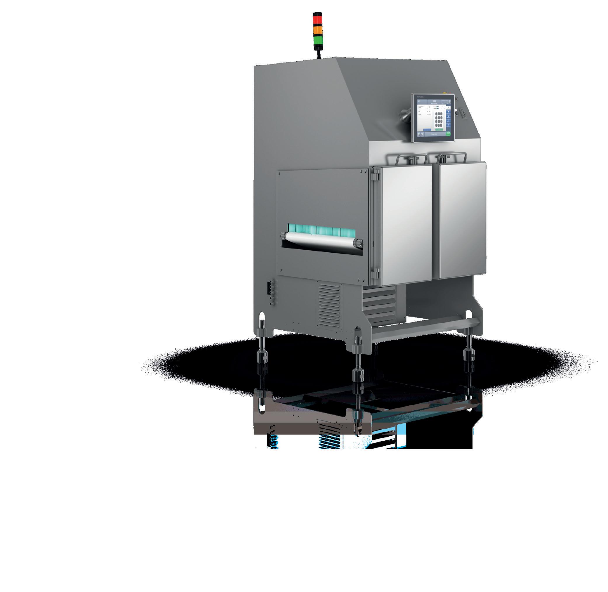 A programmable light alarm beacon provides customisable visual alerts for system status, product levels and process conditions. Wiring routed through the frame supports safe operation and streamlines washdown. An extended Mini VF infeed conveyor with side guards helps maintain product flow and reduces spillage. Optional forklift mounts facilitate safe transport around the plant. Built for sanitation, the unit provides IP65-rated washdown capability and food-grade materials throughout.