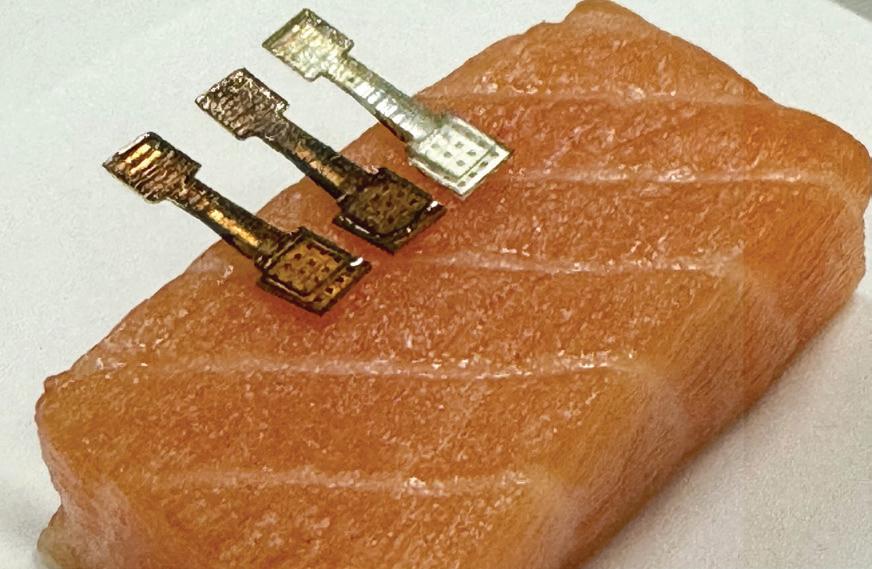 To build the sensor, the team created a four-by-four microneedle array and coated it with specialised gold nanoparticles and an enzyme that breaks down HX. The sensor is pressed into the surface of a piece of fish and anchored by the microneedles. As