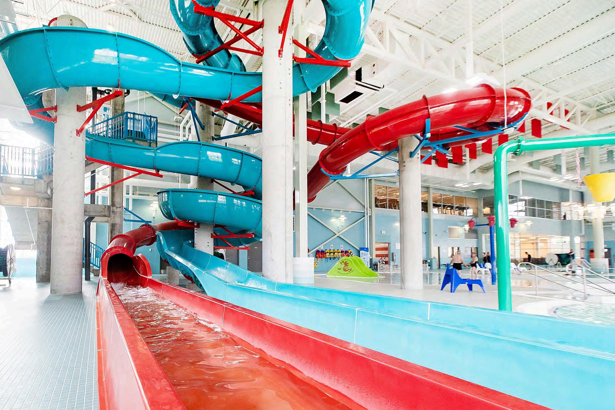 Looking to make a splash? Slide down our blue Russell & Sharalee Crawford open waterslide, or zip down the red Supreme International enclosed waterslide.