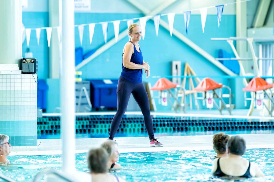 A water-based fitness class is conducted in the shallow or deep end of a swimming pool. It combines aerobic and strength exercises, using the water’s resistance to create a low-impact workout.