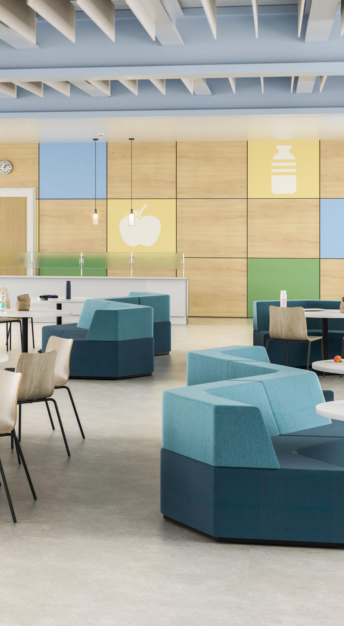 The ability to adapt school space is also showing up in the design of the furniture that area designers and experts see as key to creating the right educational environment. From options for seating in the lunchroom that go beyond the traditional fold-down tables to creating multiple classroom layouts with tables and desks, modular furniture has become a musthave for schools. ICON’s Becky Muller sees this particularly in common areas: “there are booths, high tops, low tops, banquettes, movable chairs” – options that give students and staff more possibilities to decide their level of engagement on a day-to-day basis.”