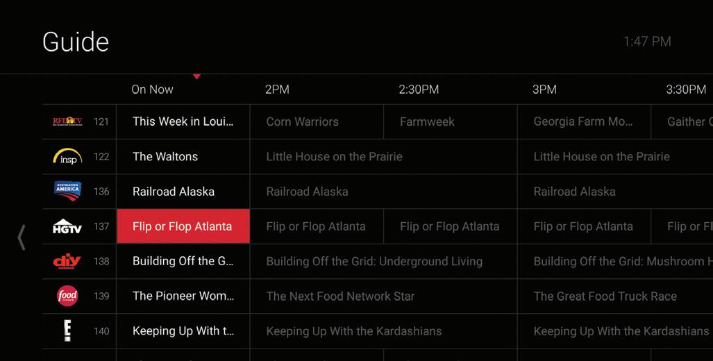 To Navigate the guide: • Apple TV: - Swipe left/right to navigate backward or forward in time - Swipe up/down to navigate through the channel numbers • Android TV & Amazon Fire TV devices: - Press right/left to navigate backward or forward in time - Press up/down to navigate through the channel numbers - Hold up/down to quickly navigate channel numbers