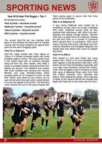 SPORTING NEWS Year 9/10 Inter-Trib Rugby – Tier 1 Mr Montgomery writes… Fleet 9 points – 44 points scored Walbrook 7 points – 35 points scored Tyburn 5 points – 20 points scored Effra 3 points – 0 points scored The annual Inter-Trib tier one matches took place on the fantastic first team pitch at Twyford Avenue with the boys excited to be against their peers for this year’s bragging rights. Fleet 15 vs Tyburn 5 Inter-Trib rugby started with Fleet taking on Tyburn in a closely contested match with some excellent rugby on show. The boys worked hard in the Tyburn team with an excellent example being set from Pip, their captain, who made a series of excellent tackles preventing Fleet from getting any ground. The deadlock was broken with some excellent ball carrying from Antonio Mendes and Jack Henniker-Gotley which provided space for JP Cairaschi to score. At half time Tyburn were down by two scores, but all was not lost when they were able to steal the ball in a ruck and register some points. The final blow came towards the end of the game though with