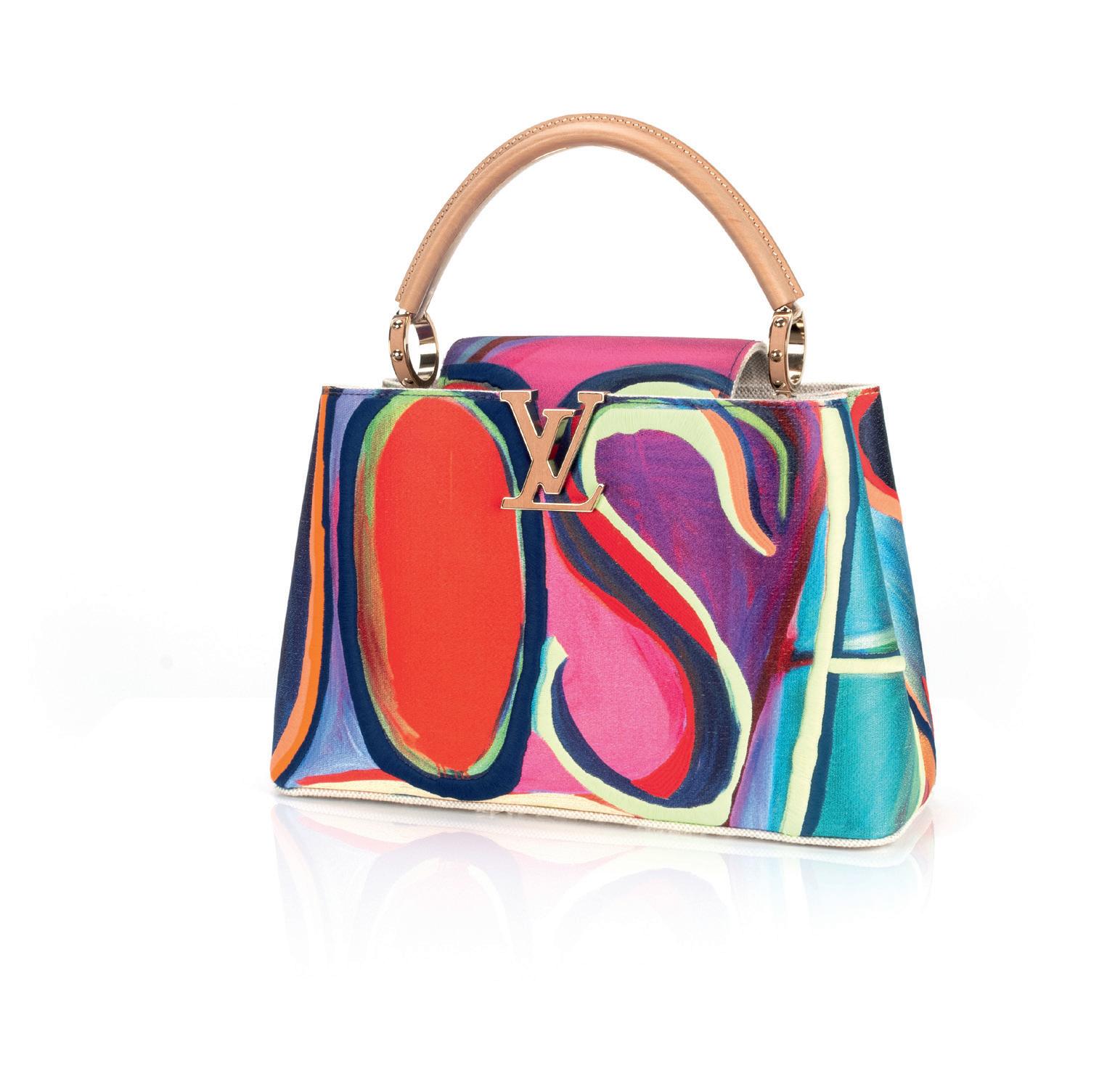 Louis Vuitton, Frankreich, Artycapucines Capsule Collection 2020, besticktes Baumwollgewebe, innen bedruckte Seide, Zierleisten aus Birnbaumholz, goldfarbene Hardware, 1 Innentasche mit Reißverschluss und 2 Steckfächer, 22 x 31 x 11 cm (ohne Henkel), innen mit Herstellerplakette, 082/200 nummeriert, innen Nummerncode, ungetragen, mit Schutzfolien, Schulterriemen, Pflegeheft, Authentizitätszertifikat, Rechnung in Kopie, Staubbeutel, Box und Tüte anbei. Seit 2013 gibt es das Modell ‘Capucines’ von Louis Vuitton, welches im Namen an den ersten Pariser Hauptsitz des Modehauses in der Rue Neuves des Capucines erinnern soll. Seither hat das Modell Ikonenstatus erreicht. 2019 wurden zum ersten Mal die nun jährlich erscheinenden ‘Artycapucines’-Sondereditionen des Klassikers produziert. Bei dem Projekt werden internationale Künstler*innen gebeten, die Taschen neu zu designen, von dessen Designs eine streng limitierte Stückzahl von 200 Exemplaren produziert werden. So hat auch der international renommierte Künstler Josh Smith (1976, Okinawa, Japan) 2020 dieses beeindruckende Sammlerstück gestaltet. In Anlehnung an seine charakteristischen “Namens”-Gemälde hat Smith seinen Vornamen auf die Tasche gedruckt und gestickt. Das Innenfutter ist mit Palm #3, 2019, einem von Smiths farbenfrohen Gemälden, bedruckt.
