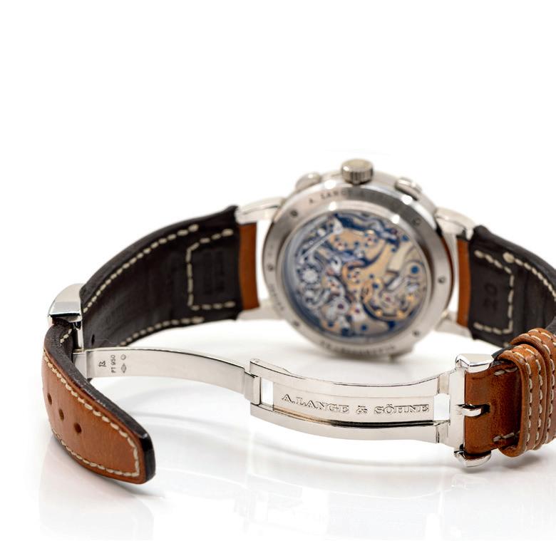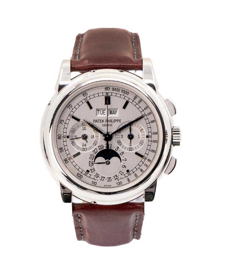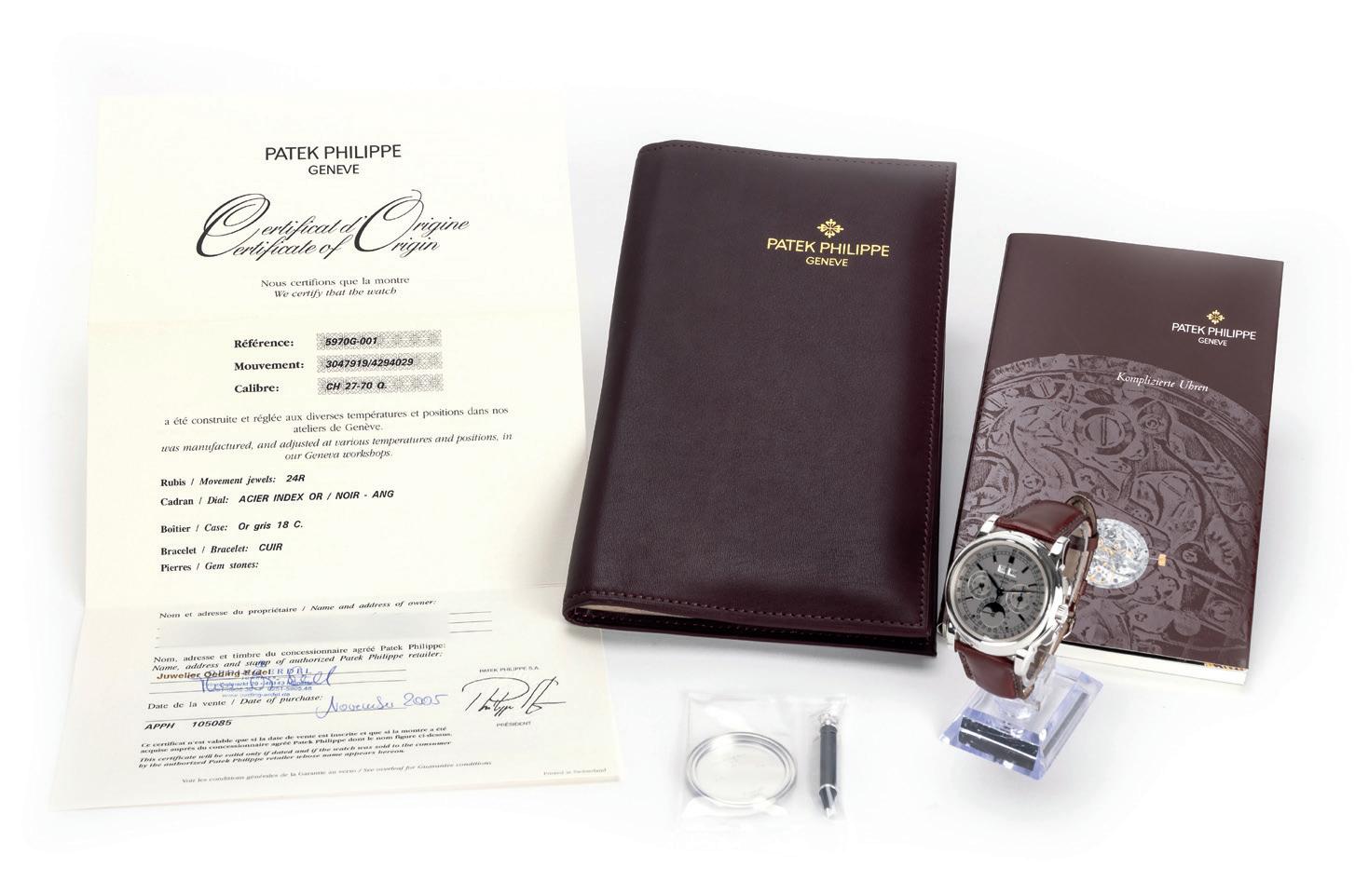 Jahr 2005, Handaufzug, Chronograph, Tachymeterskala, Ewiger Kalender, Mondphase, Schaltjahresanzeige, Monats-, Wochentags- und Datumsanzeige, 24-Stunden-Zähler, 30-Minuten-Zähler, kleine Sekunde, Sichtboden, Werk-Nr. 3047919/4294029 | Ref.-Nr. 5970G-001 | Cal. 70-155 | Cal. CH 27-70 Q, 24 Rubine, Gehäuse 750 Weißgold, punziert, Durchmesser 40 mm, Armband ergänzt, Leder, Original-Schließe, 750 Weißgold, punziert, Länge 15 cm, verstellbar, Gesamtgewicht ca. 109,1 g, Funktion gangbar, geprüft, Zustand gut, Zeiger leicht korrodiert, Zustand und Funktionalität durch unseren Uhrmachermeister geprüft, ohne Original-Box, mit Original-Umverpackung und -Papieren, Original-Mappe mit Ursprungszertifikat, The Patek Philippe Register, The Collector’s Library, Distributors/Retailers & Service Centers, Komplizierte Uhren, Stellstift, Original-Schraubboden, 750 Weißgold anbei, Anmerkung: Das Aufgeld beträgt 14,28% inkl. MwSt. Für die Nutzung der Online-Bietkonsolen fällt eine zusätzliche Gebühr in Höhe von 3% zzgl. MwSt. (3,57%) an.