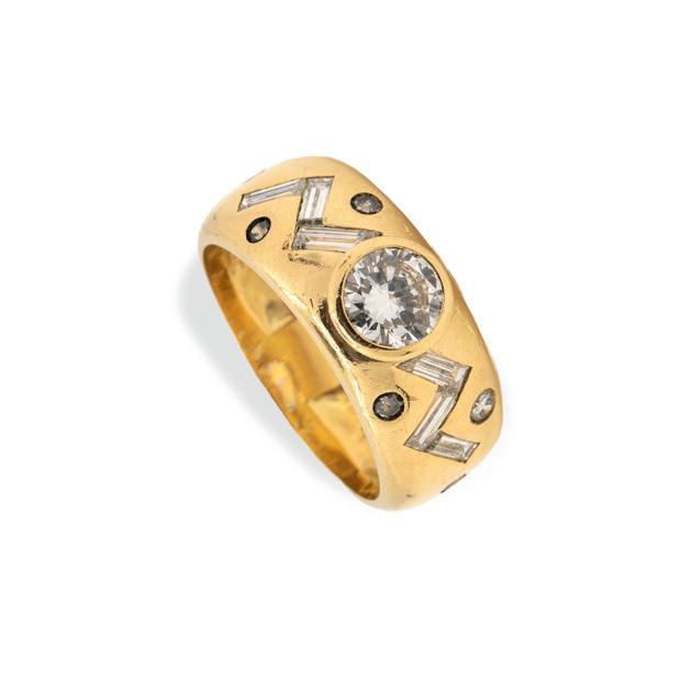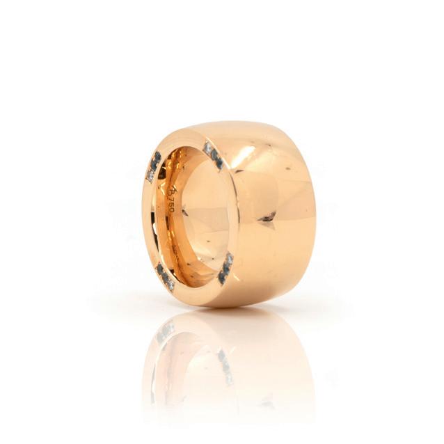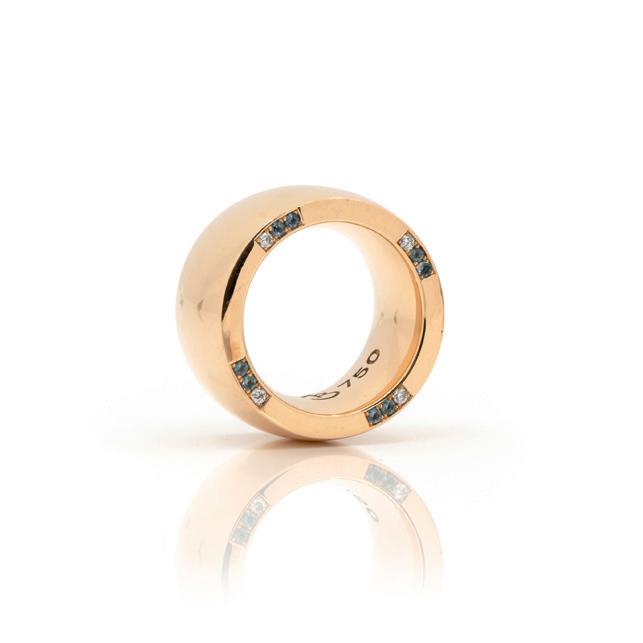 750 Gelbgold, punziert, über einer blauen Emaille Halbkugel 20 Diamanten im Brillantschliff, gesamt ca. 0,30 ct, H-I, vs, RW 56, verstellbar, Gewicht ca. 19,2 g