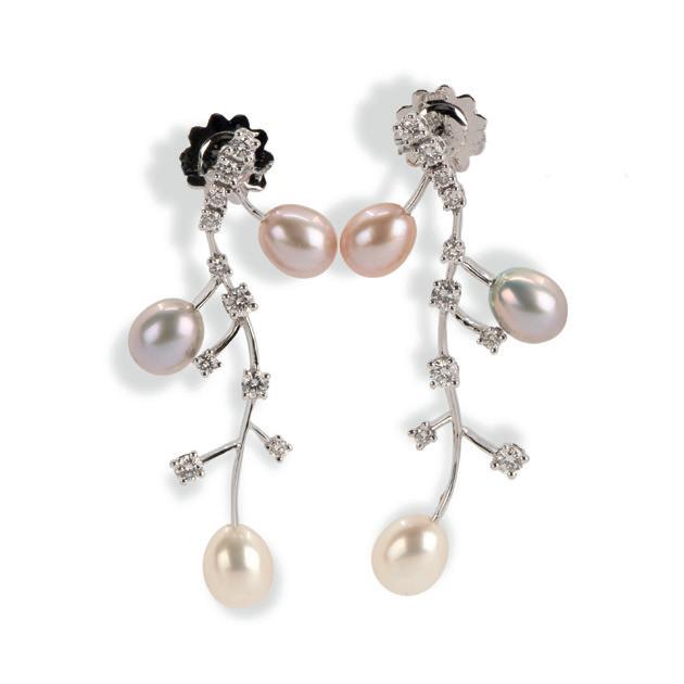 4-tlg., Ohrringe 585 Weißgold, punziert, jeweils ein Anhänger mit einer Südseeperle, Ø 10 mm, dazu ein Anhänger Rüschenbeck, 750 Weißgold, punziert, Markenpunze, mit 7 facettierten Saphiren in rosa, gelb, orange, grün und blau und ein Anhänger mit rosa Saphir im Dreiecksschliff, Länge Perlohrringe 2,5 cm, Gesamtgewicht ca. 9 g