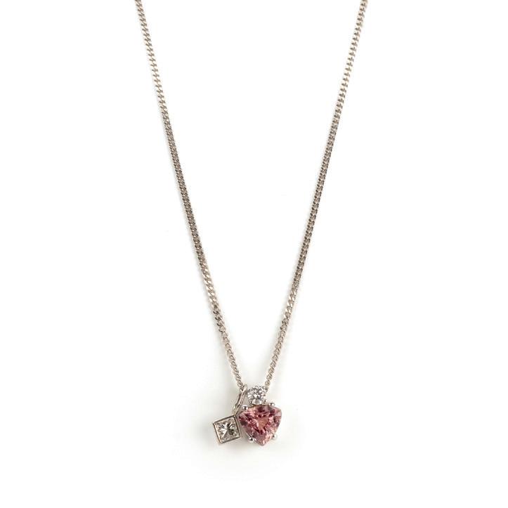 Kette 585 Weißgold, punziert, ein Anhänger 750 Weißgold, punziert, 2. Anhänger 585 Weißgold, ein Anhänger mit 1 rosafarbenem Turmalin im Dreiecksschliff, ca. 1,66 ct und 1 Diamanten im Brillantschliff, ca. 0,15 ct, ein zweiter Anhänger mit 1 Diamanten im Prinzessschliff, ca. 0,385 ct, beide Diamanten G, vsi, Länge Kette 43 cm, Länge Turmalin-Anhänger 1,1 cm, Gesamtgewicht ca. 6,1 g, Zertifikat für den Prinzess-Diamanten von 1996 anbei