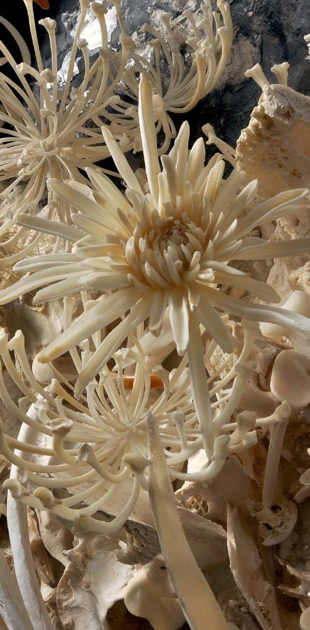 Animal remains—antlers, horn, teeth, tusks, and bone—feature prominently in Trask’s work, transformed into radiant, organic forms that bloom with vitality, evoking cycles of death, transformation, and rebirth. At first glance, her pieces captivate with their elegance, but closer inspection reveals layers of intricacy: antlers woven seamlessly into sculptural forms, snake vertebrae forming delicate flower petals, and bones sourced from giraffes, chickens, cows, and camels integrated into compositions that challenge perceptions of life and decay.
