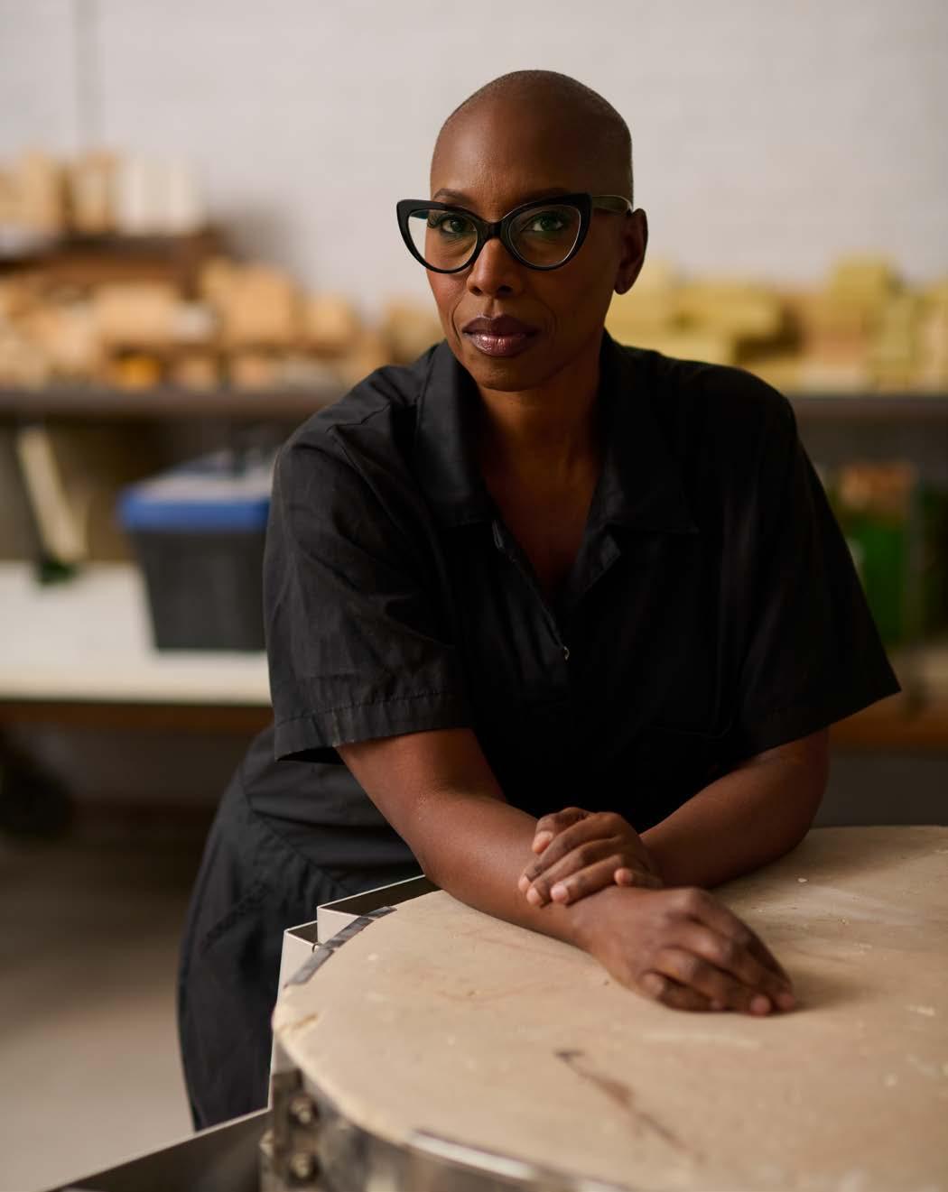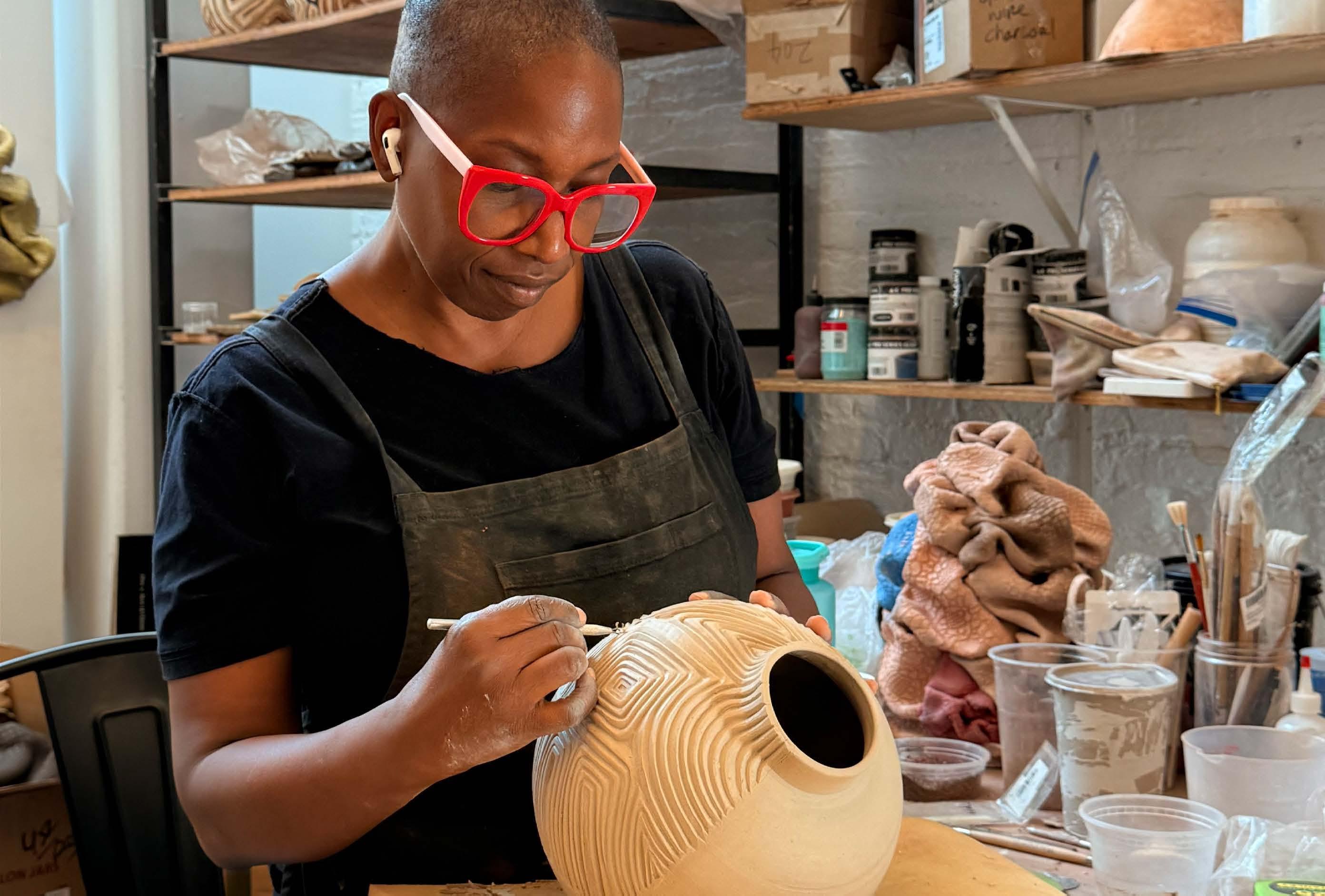 Malene Djenaba Barnett is an award-winning multidisciplinary artist, textile designer, and community builder based in Brooklyn, New York. Her work explores how objects, symbols, and material traditions carry memory across generations of the African diaspora. In three recent bodies of work— Black Power Scripts, a series of ceramic wall murals; Fragment Futures, a continuation of her celebrated explorations of the Jamaican yabba vessel; and Illusions of Softness, a series of ceramic vessels that translate delicate lace doily patterns into sculptural clay forms—Barnett examines how language, domestic objects, and material culture can recover histories that have been fragmented, suppressed, or overlooked. Working primarily in clay, she draws from architectural, textile, and ceramic traditions across Africa and the Caribbean to create objects that function as vessels of memory and declarations of cultural resilience.