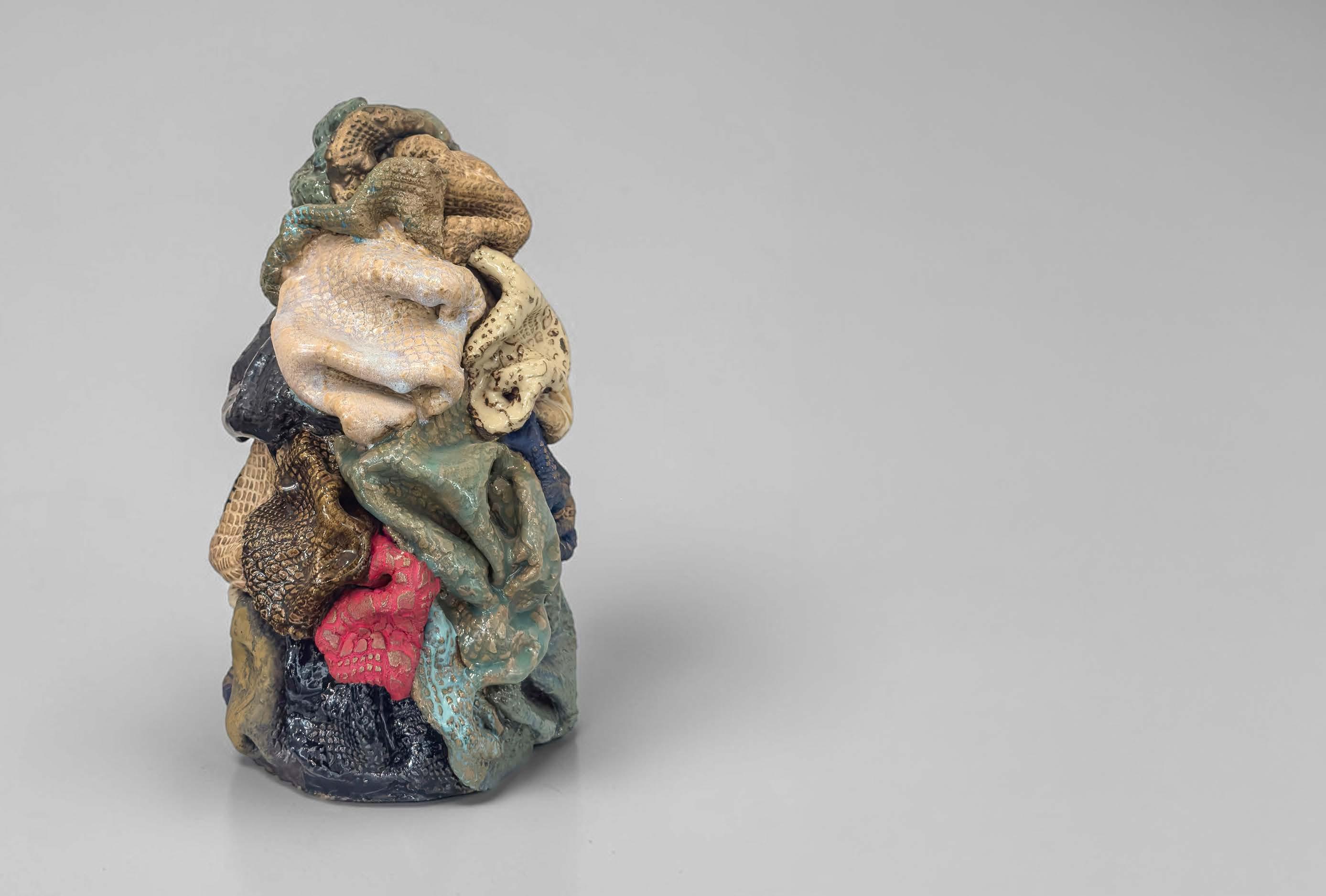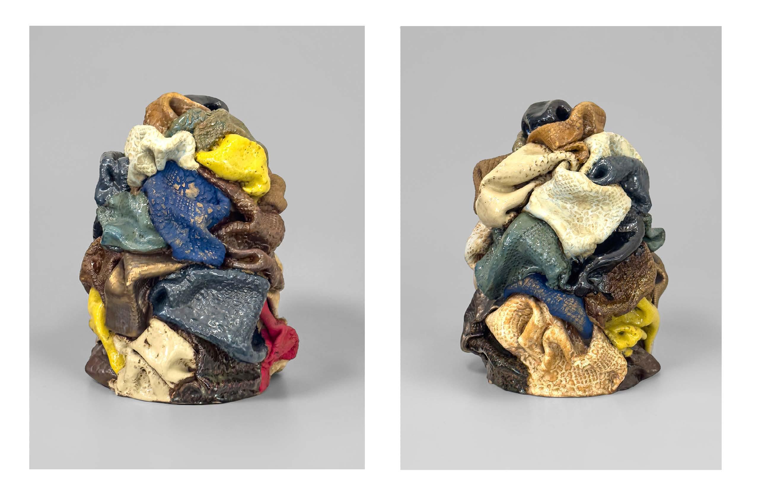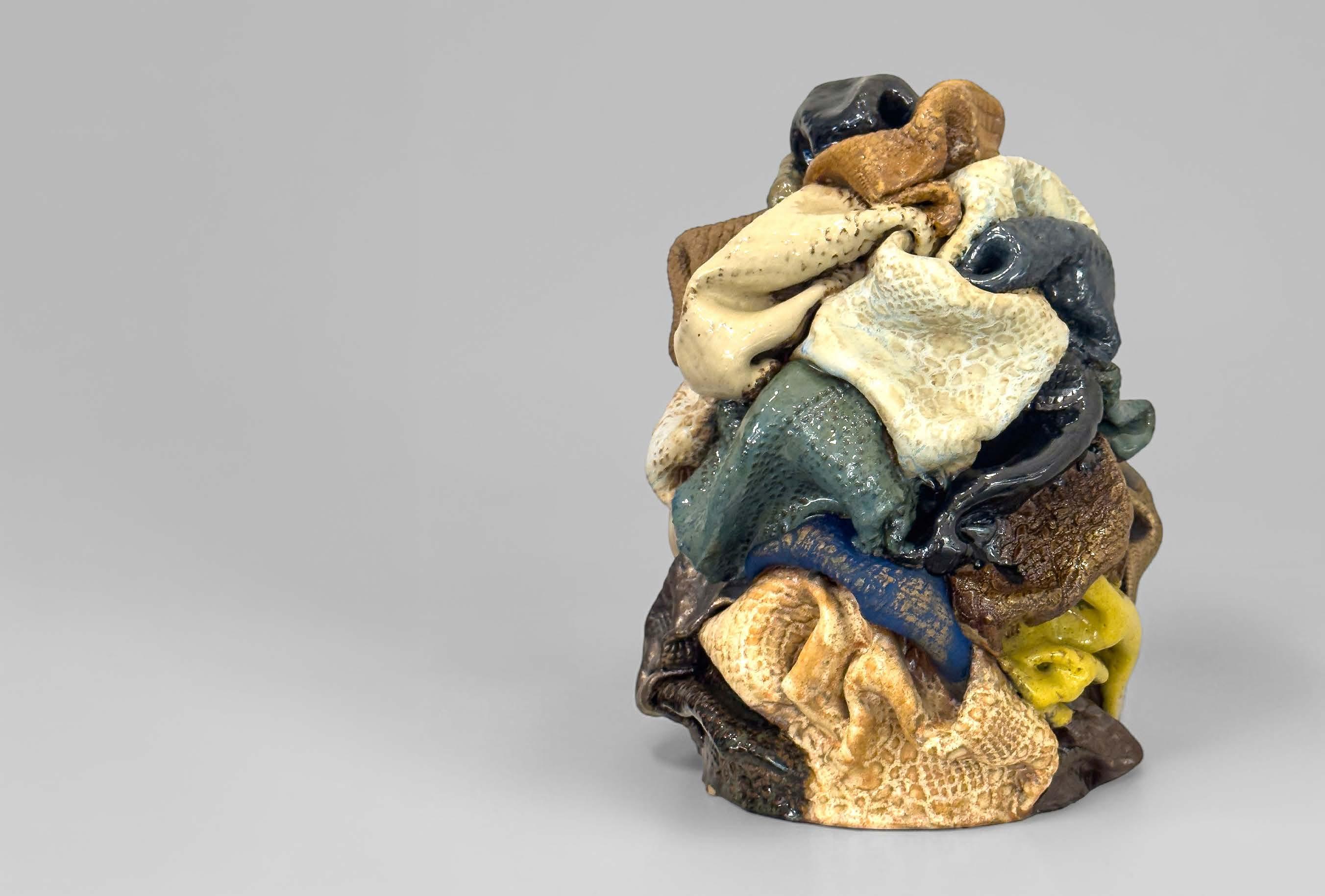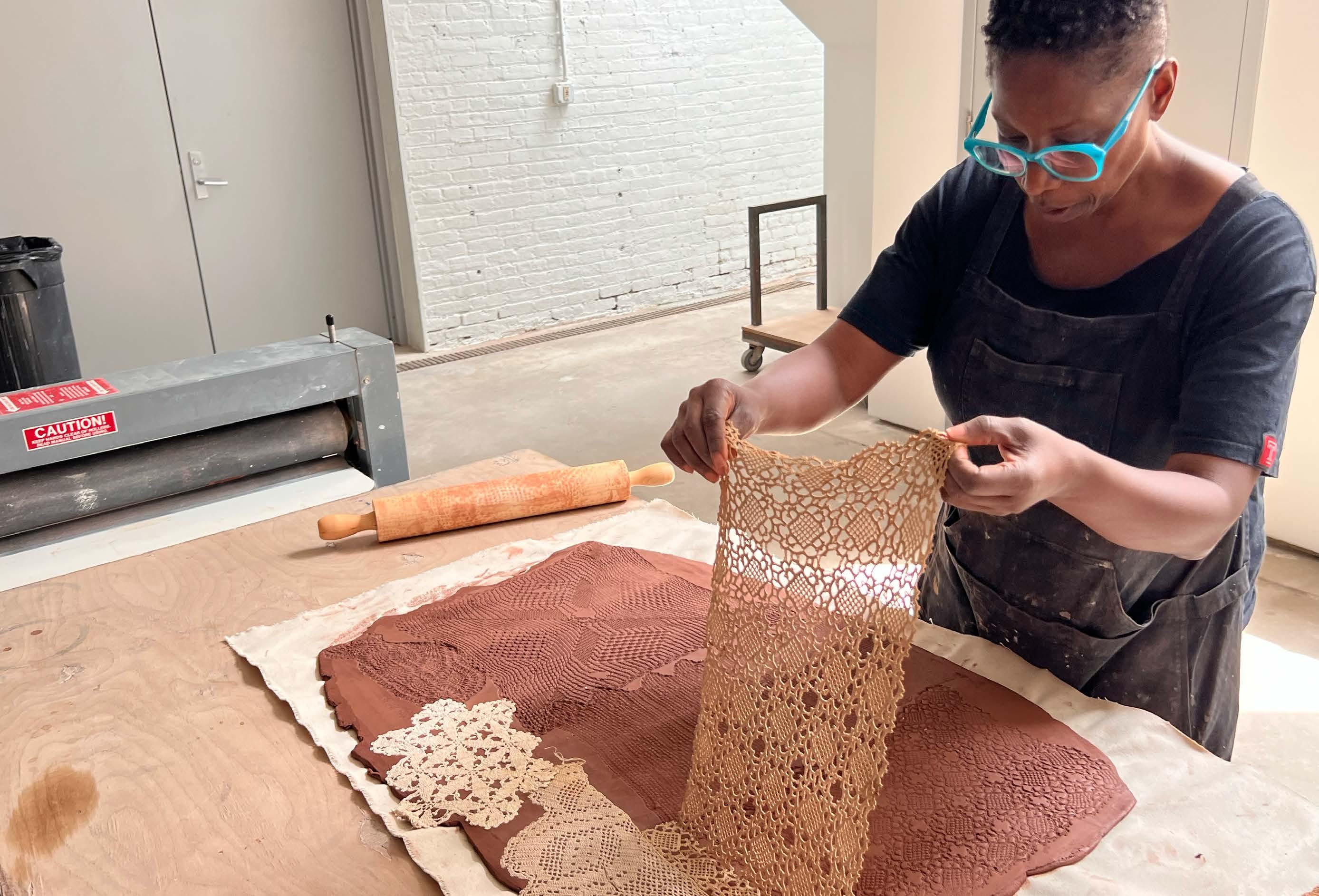 In this series, Barnett molds and embeds patterns from doilies collected from her family and Southern thrift shops into clay vessels that appear crumpled yet elegant. Fragile lace patterns translate into durable ceramic surfaces, creating tension between softness and permanence. Through this transformation, the works reflect how Black diasporic communities—like the doilies themselves—have continually reshaped inherited forms into expressions of identity, care, and cultural strength.