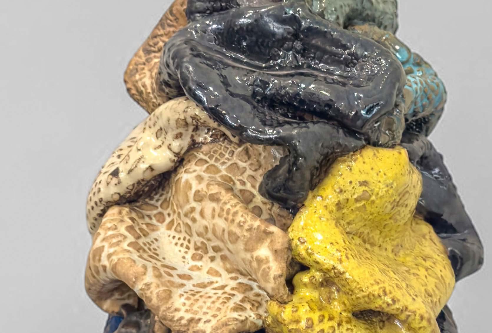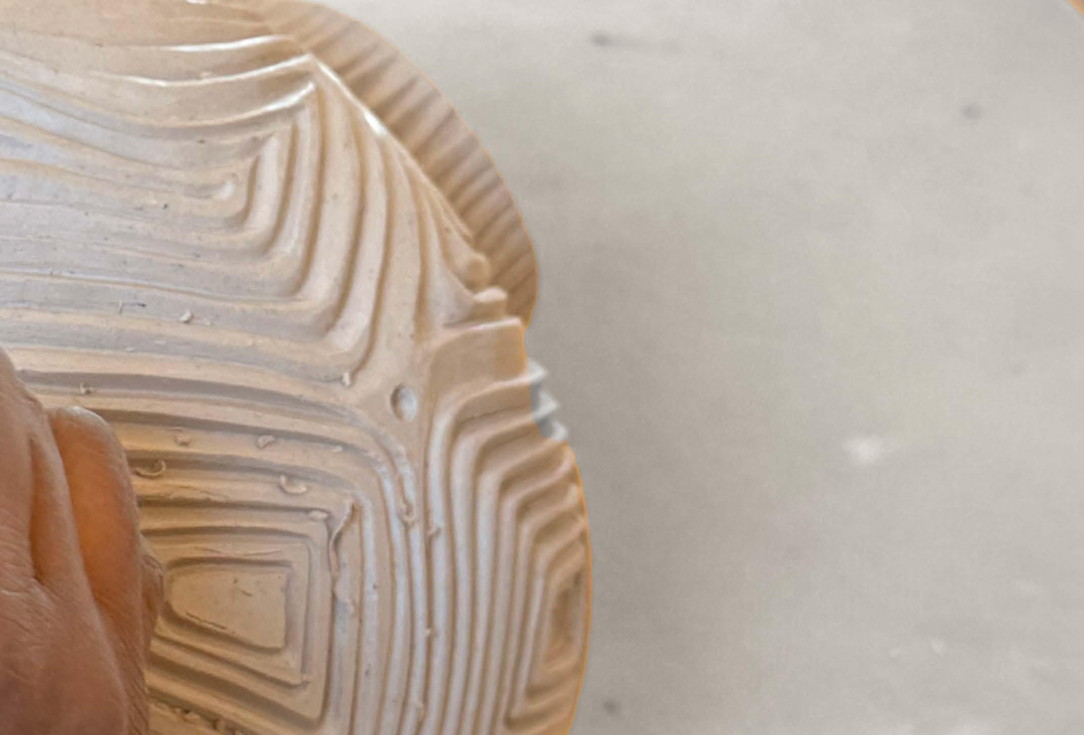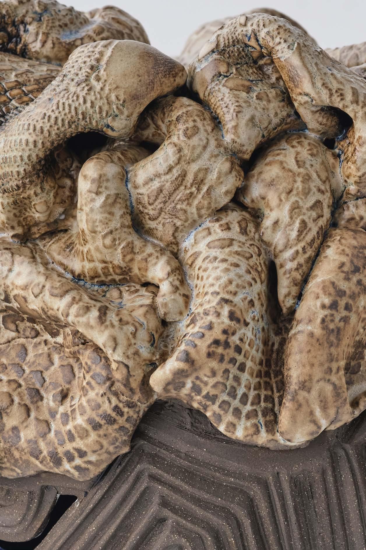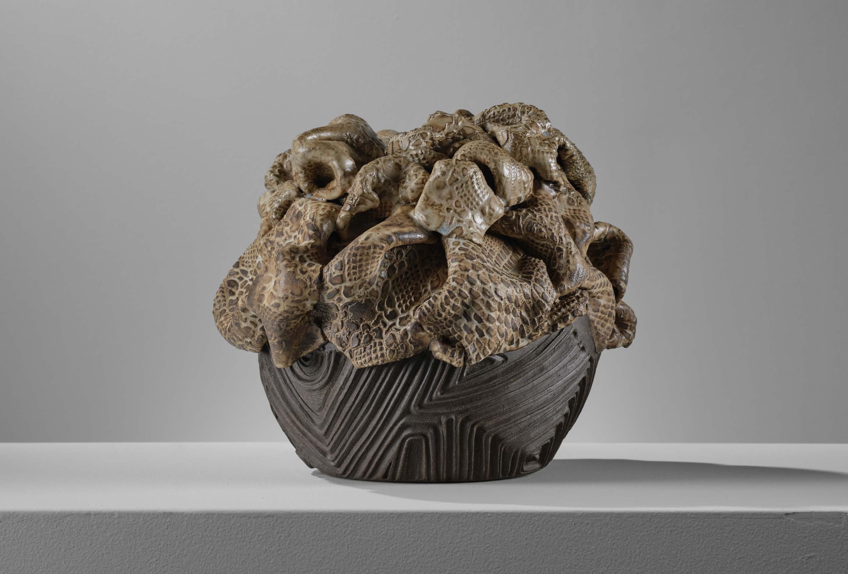 In this series, Barnett molds and embeds patterns from doilies collected from her family and Southern thrift shops into clay vessels that appear crumpled yet elegant. Fragile lace patterns translate into durable ceramic surfaces, creating tension between softness and permanence. Through this transformation, the works reflect how Black diasporic communities—like the doilies themselves—have continually reshaped inherited forms into expressions of identity, care, and cultural strength.