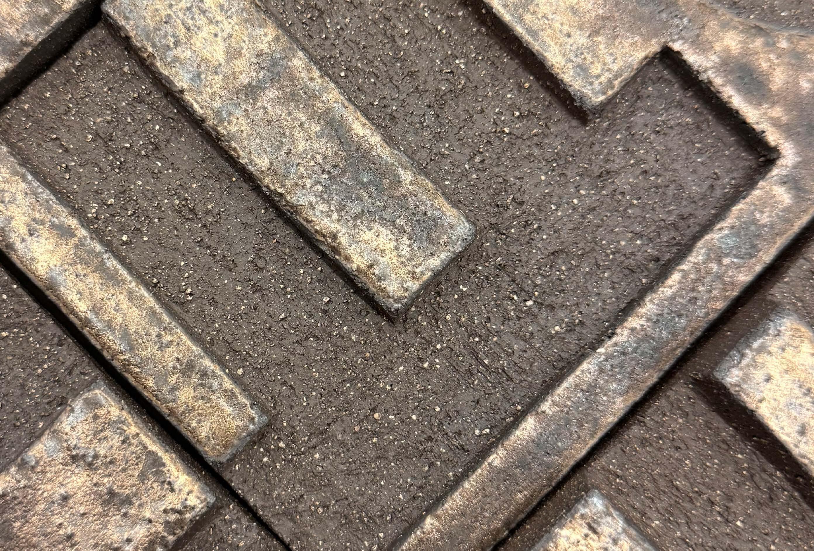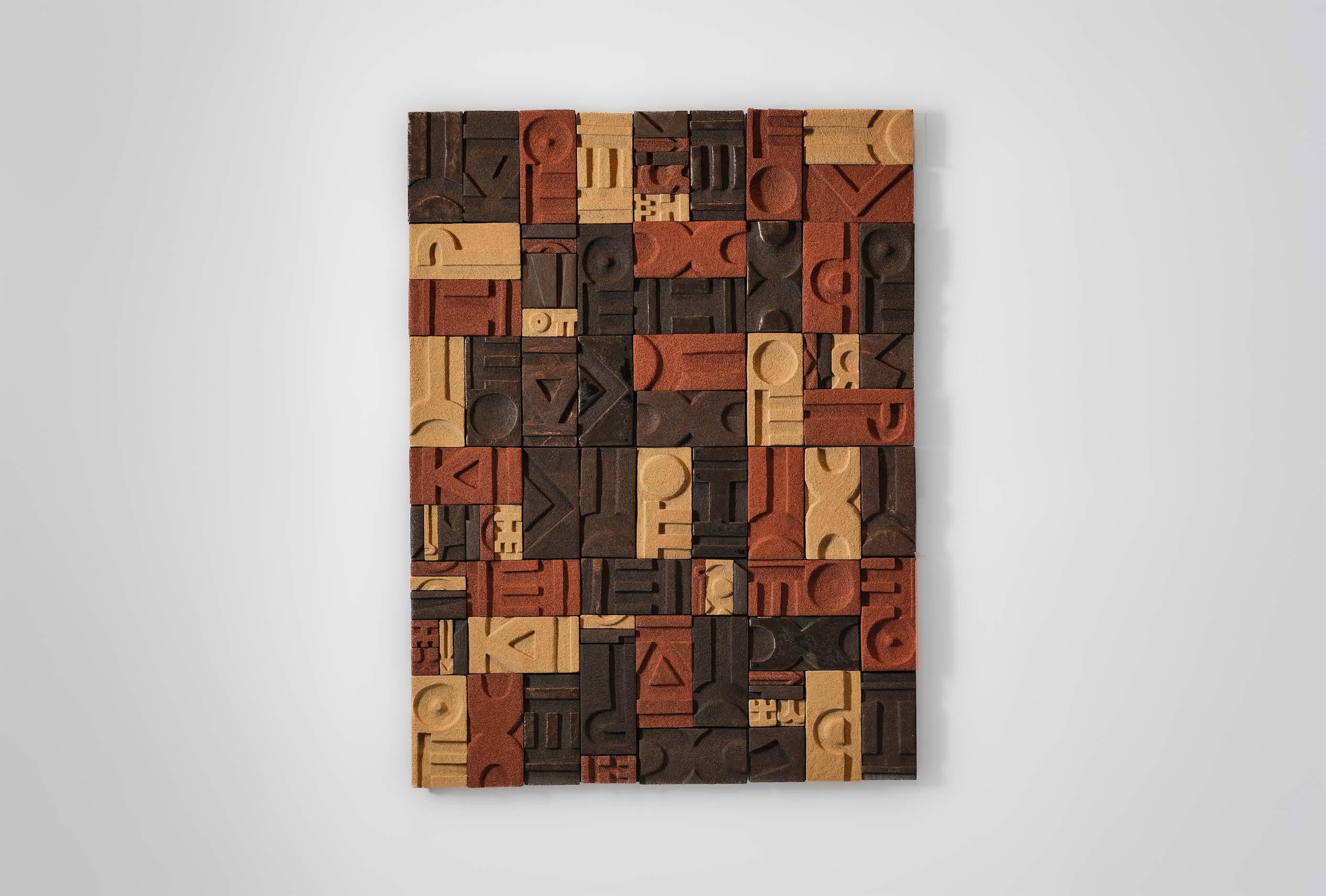 The compositions also echo the geometric rhythms of Kuba and Kente cloth, translating the visual language of these textiles into carved clay surfaces. Drawing on personal and ancestral connections to Ghana and the broader African diaspora, the works ask what forms of language and identity might emerge when colonial frameworks are set aside and older systems of knowledge are reclaimed. In this context, the carved Adinkra letters function as both cultural affirmation and contemporary shield, each mural asserting that Black power is self-defined, enduring, and carried within.
