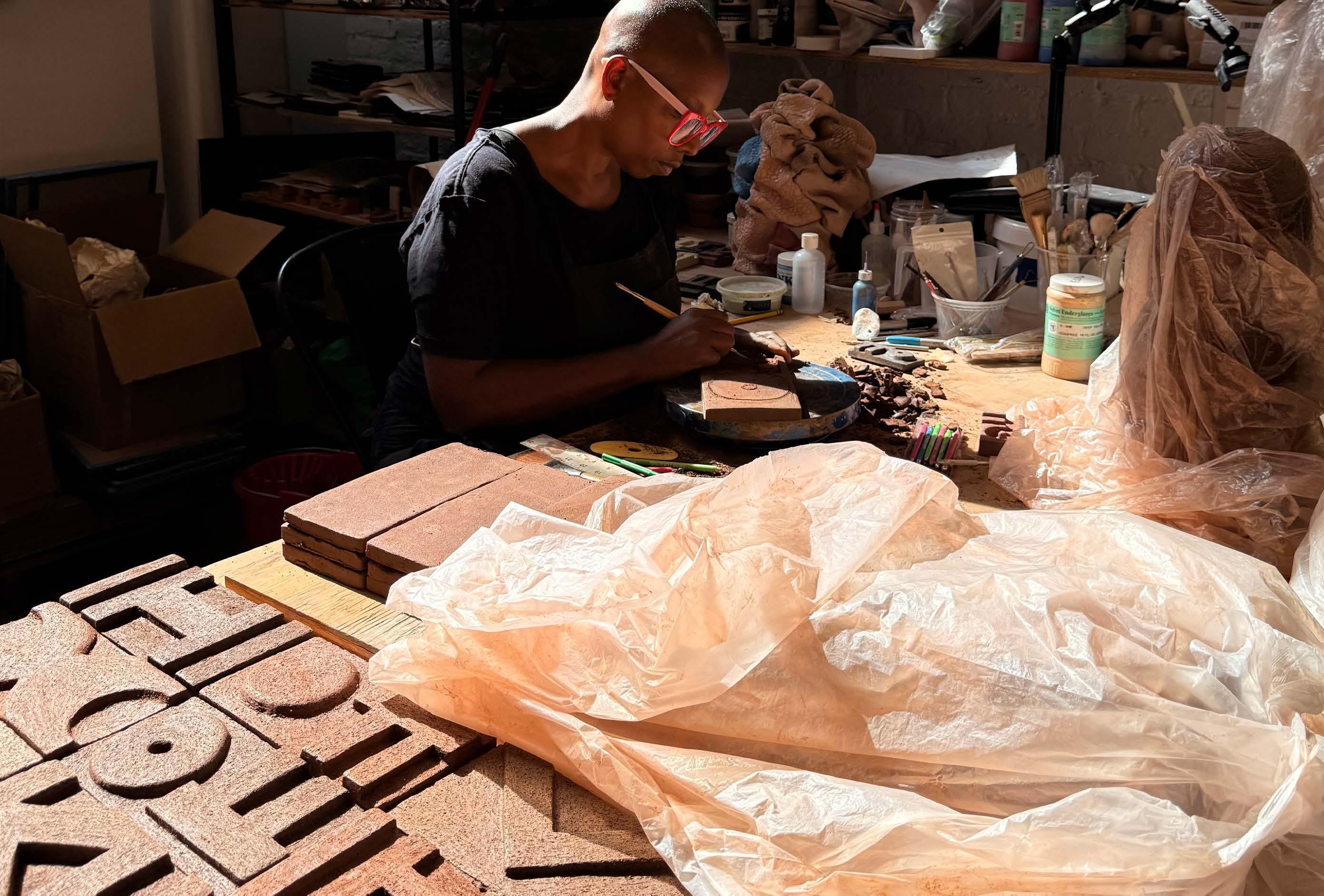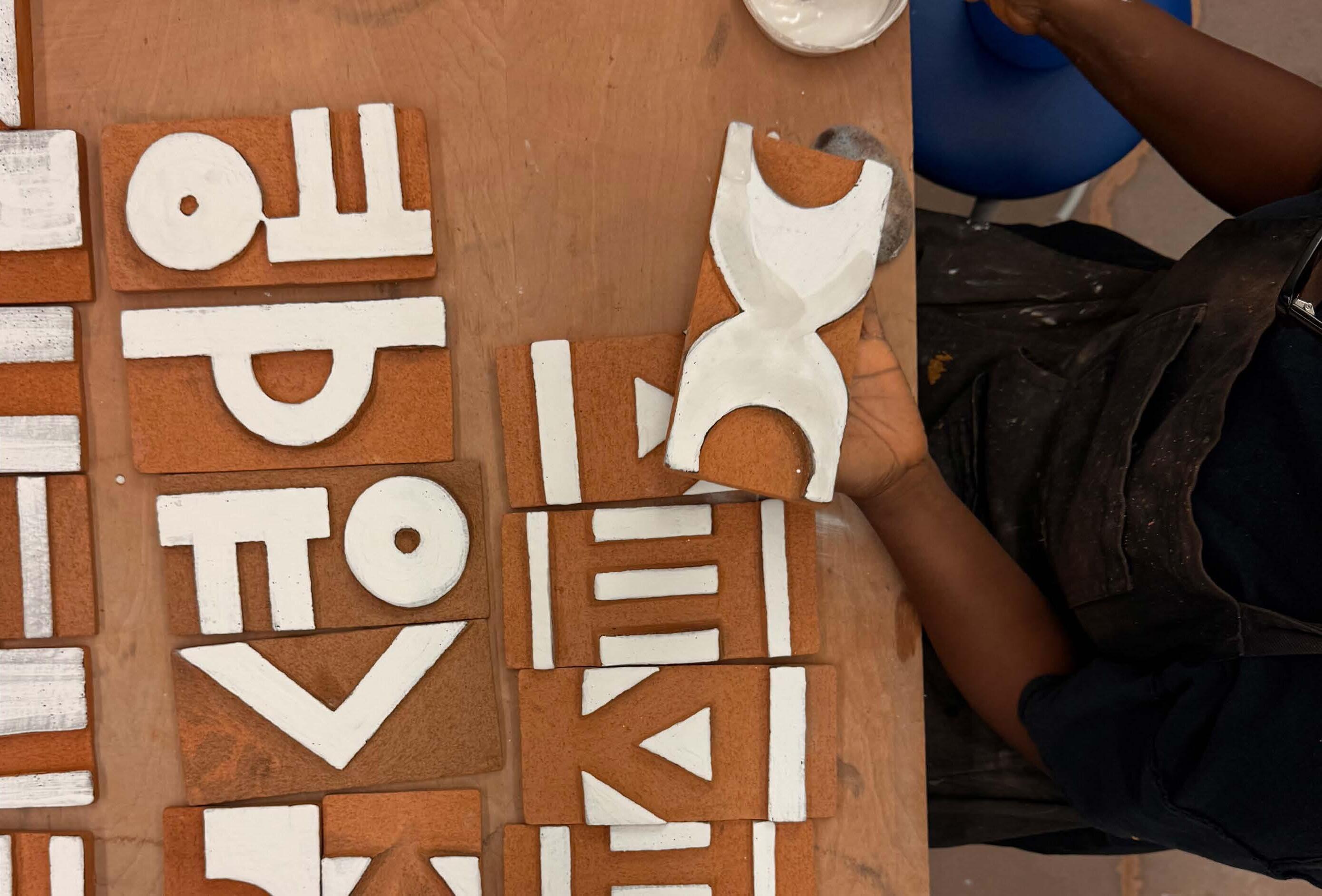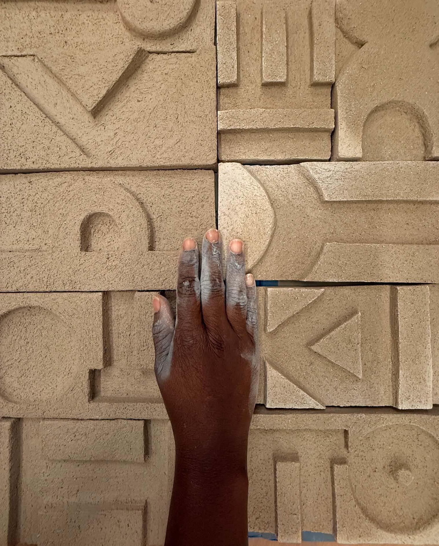 The carved clay surfaces draw inspiration from the façades of Nubian and Hausa architecture, where walls were historically inscribed with proverbs, blessings, and protective phrases meant to guide and safeguard communities. Barnett reimagines this architectural lineage through ceramic tile murals that transform clay into a vessel for memory, protection, and belonging. Words become structure; inscription becomes shelter.