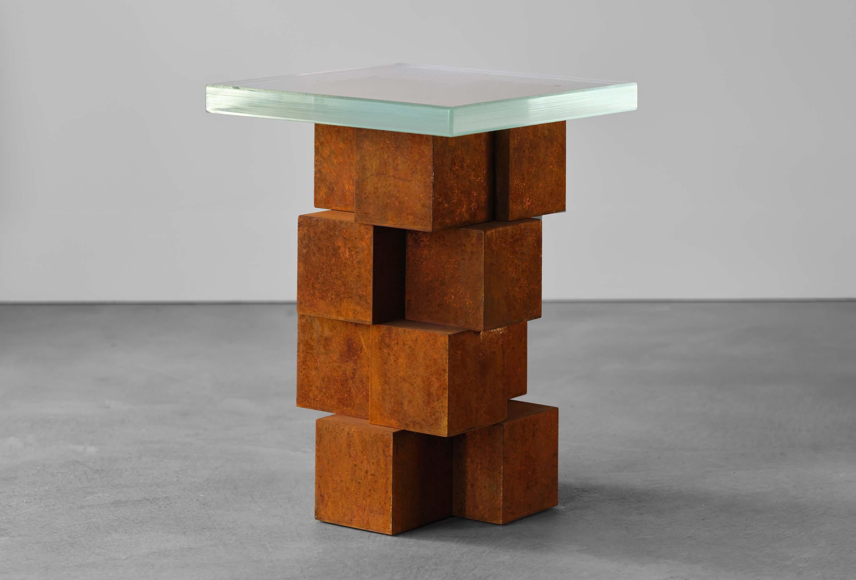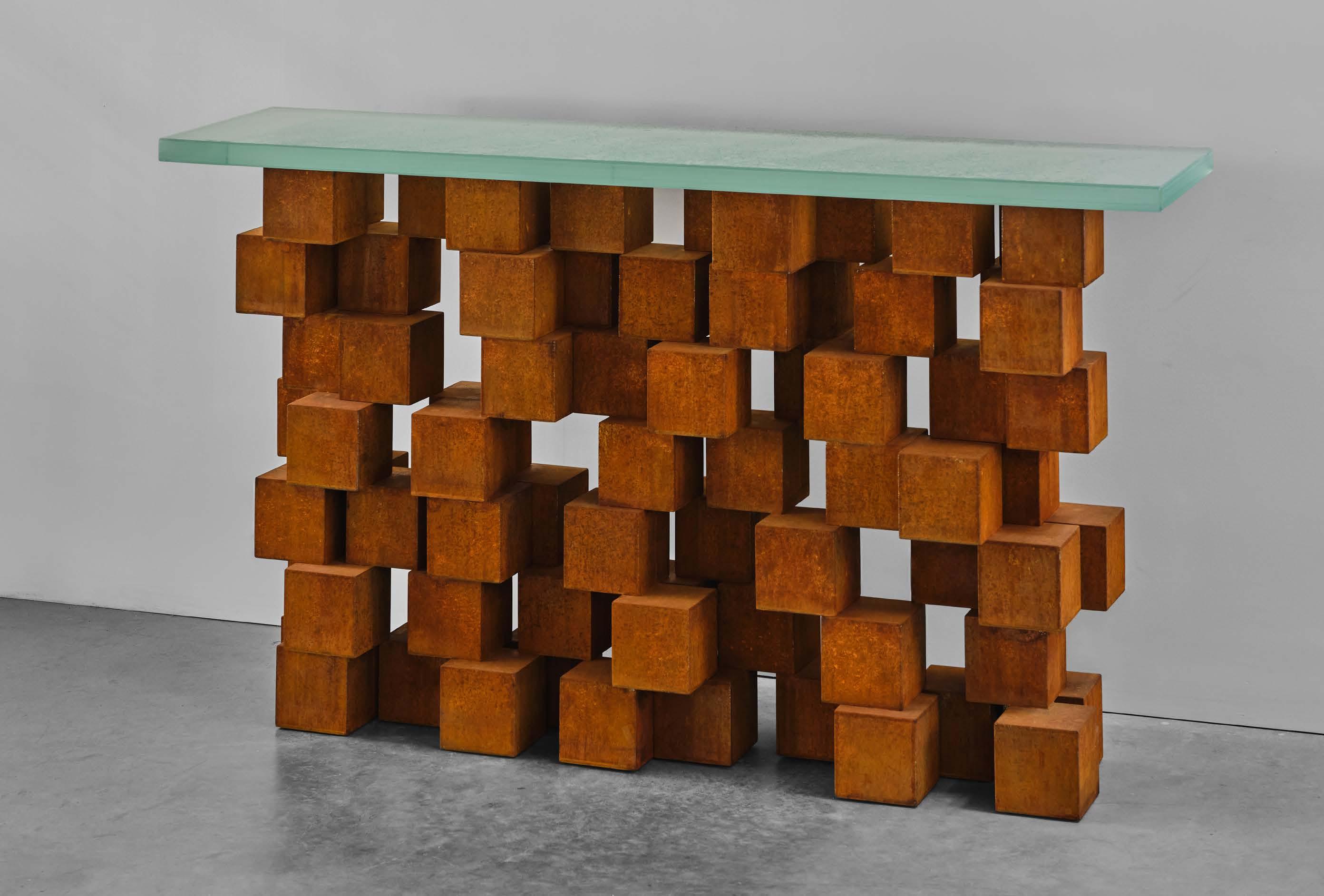 Corten steel cubes, glass, 31.5 x 20 x 66 inches
