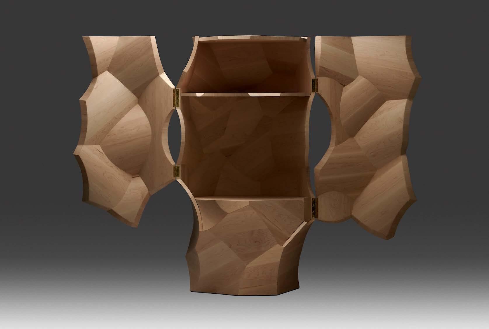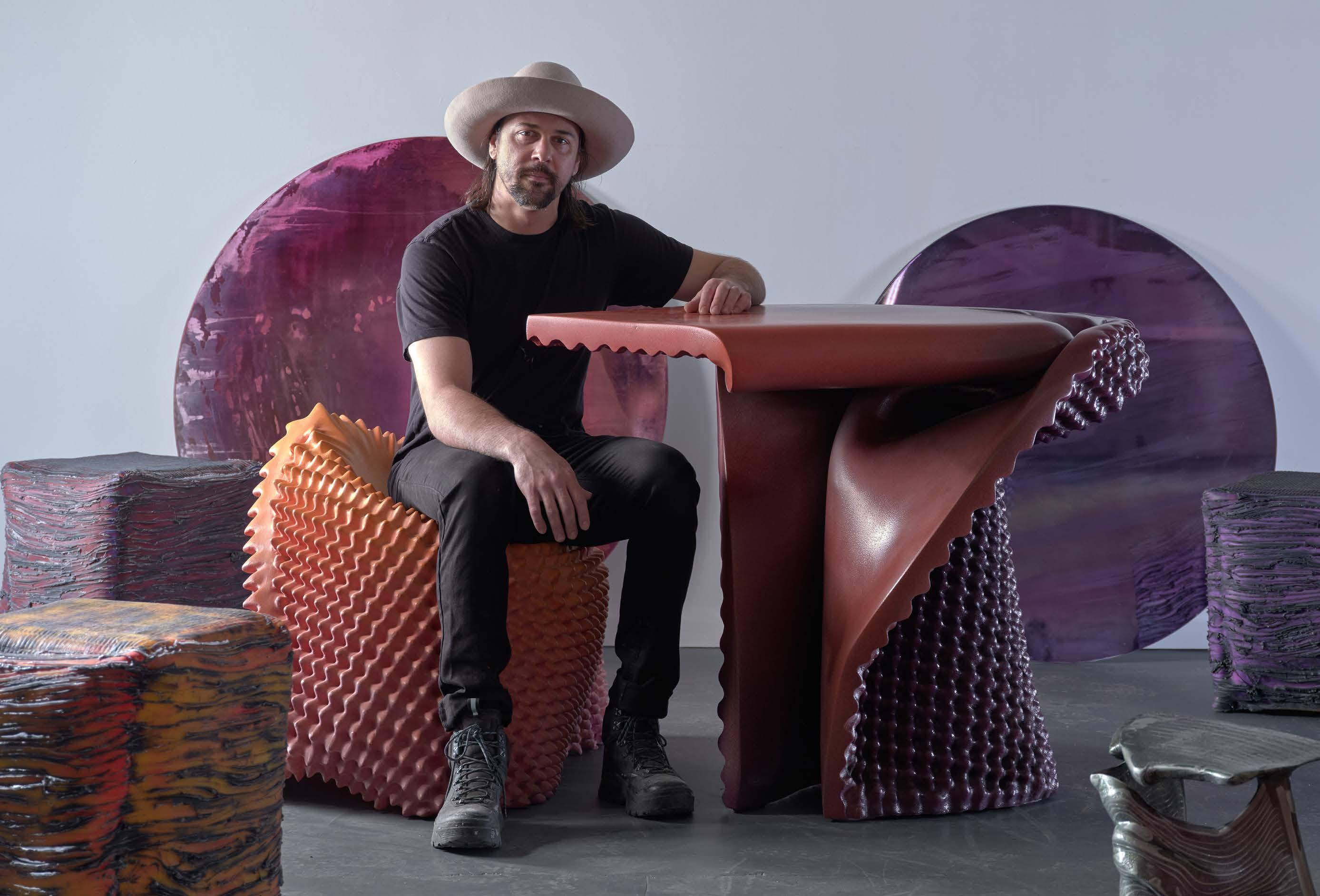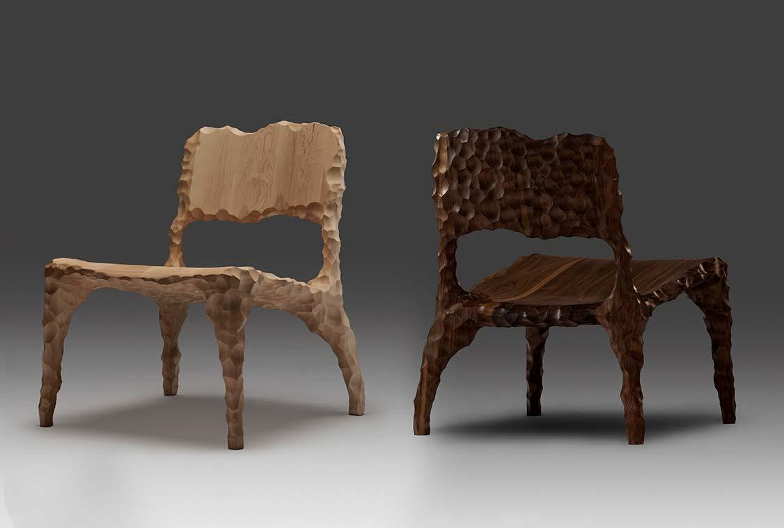 Ezra Ardolino, educated as an architect, is an artist and entrepreneur working at the intersection of art, architecture, and design through digital fabrication. In 2009 he founded Timbur, a New Jersey–based studio pushing the boundaries of CNC and robotic manufacturing in collaboration with leading artists, designers, and brands. His practice centers on Futurewood, an innovative use of plywood as a sculptural medium, shaped by years of technical experimentation and hands-on problemsolving. In 2023, he debuted N90N, a collectible design series exploring the moment when digital form transcends code, transforming polygon-based models into layered, hand-finished Futurewood objects that blur the line between virtual precision and material reality.