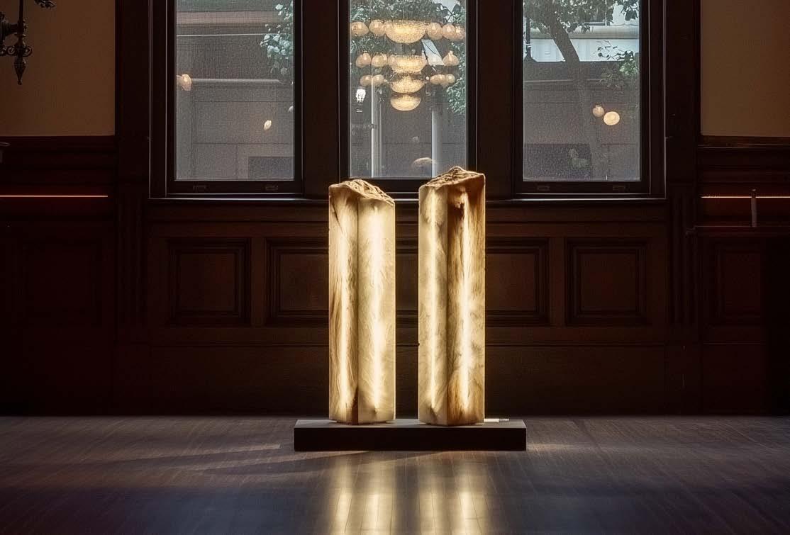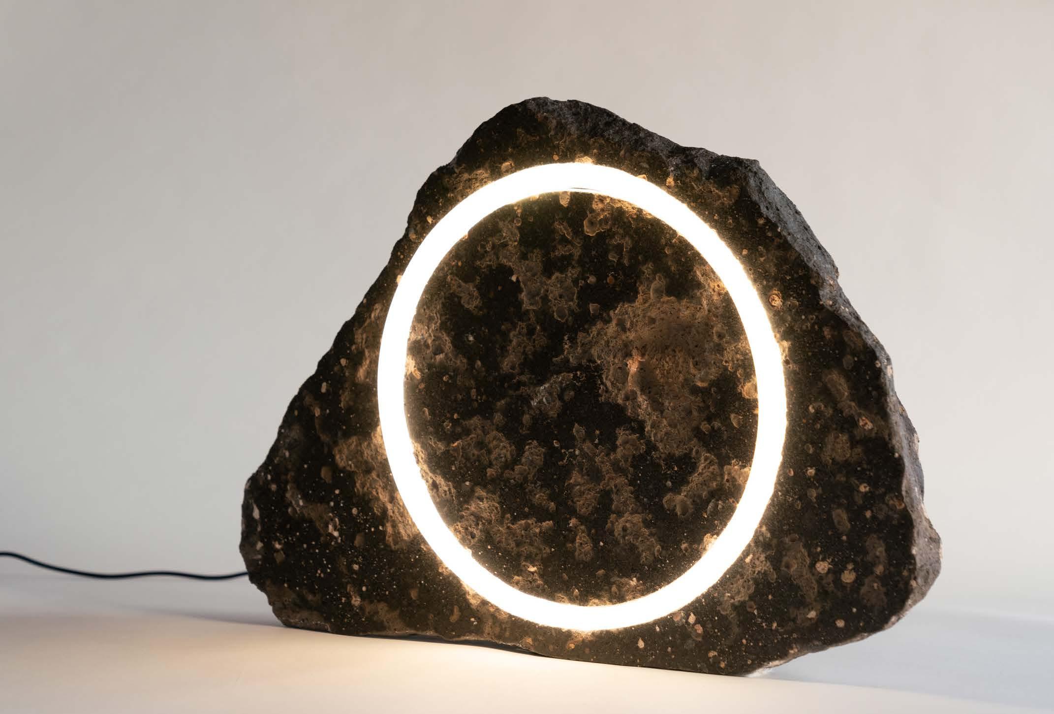 Marcus Vinicius De Paula is a Brazilian-American sculptor based in New York whose practice explores identity, ancestry, and humanity’s place within the cosmos. The son of Brazilian immigrants—his father having risen from a small town in São Paulo to directing NASA Mars missions—De Paula reflects on legacy and fragility through stone and light. His sculptures, often titled after moons of Saturn, blend volcanic rock, granite, and alabaster—some over a billion years old—with neon and LED illumination, producing works that read as relics from another world. By handcrafting both stone forms and glass light elements, he creates monumental objects that fuse the ancient and futuristic, evoking both interstellar matter and human aspiration.