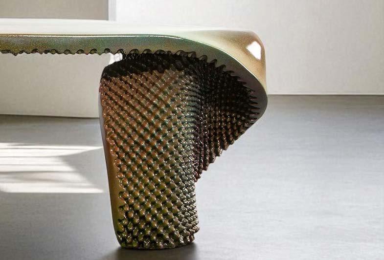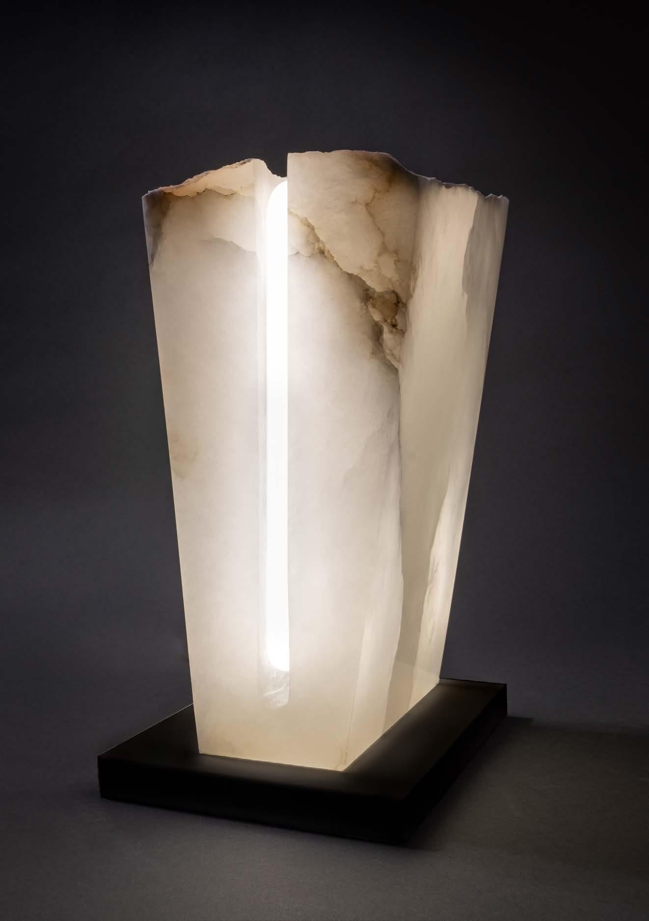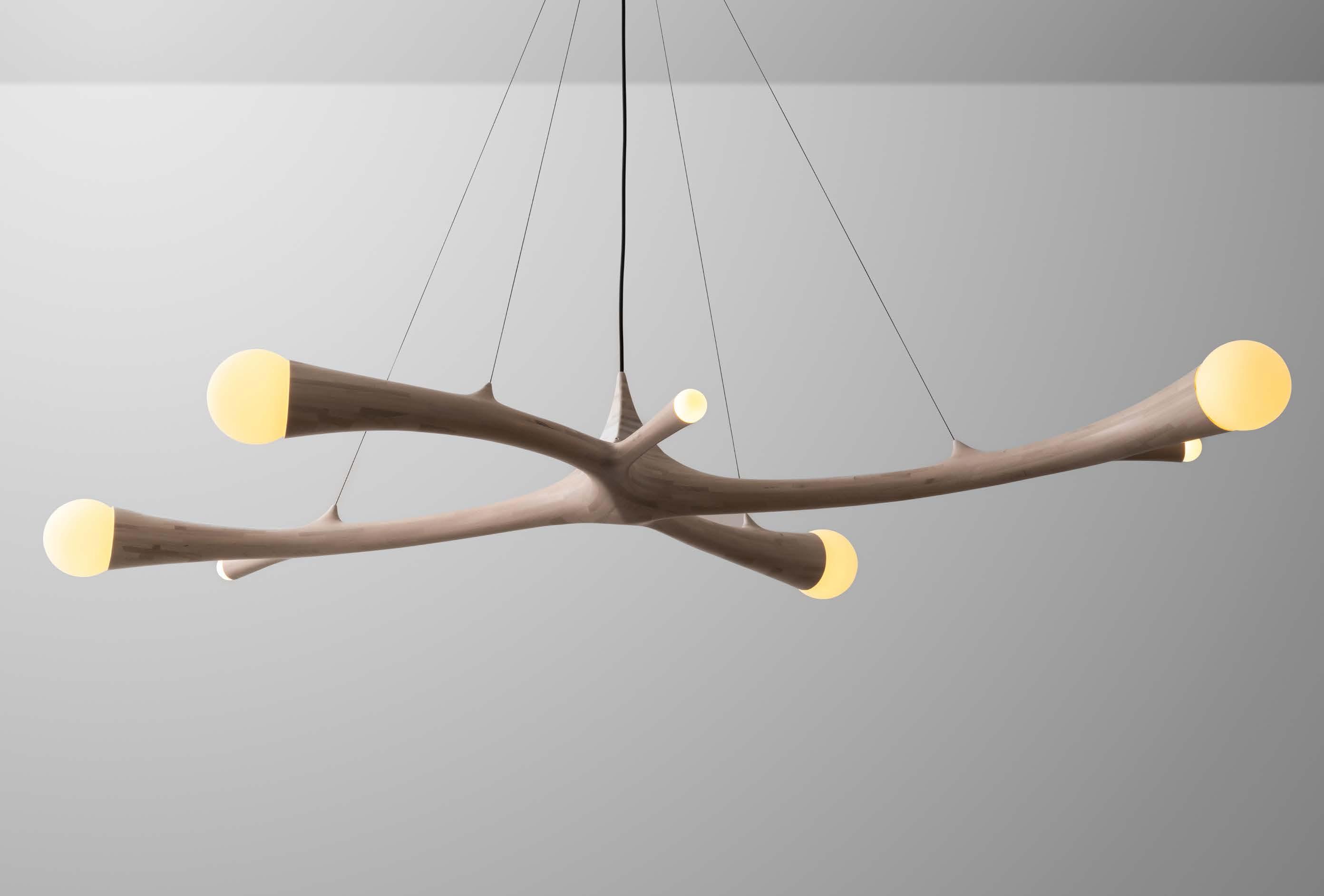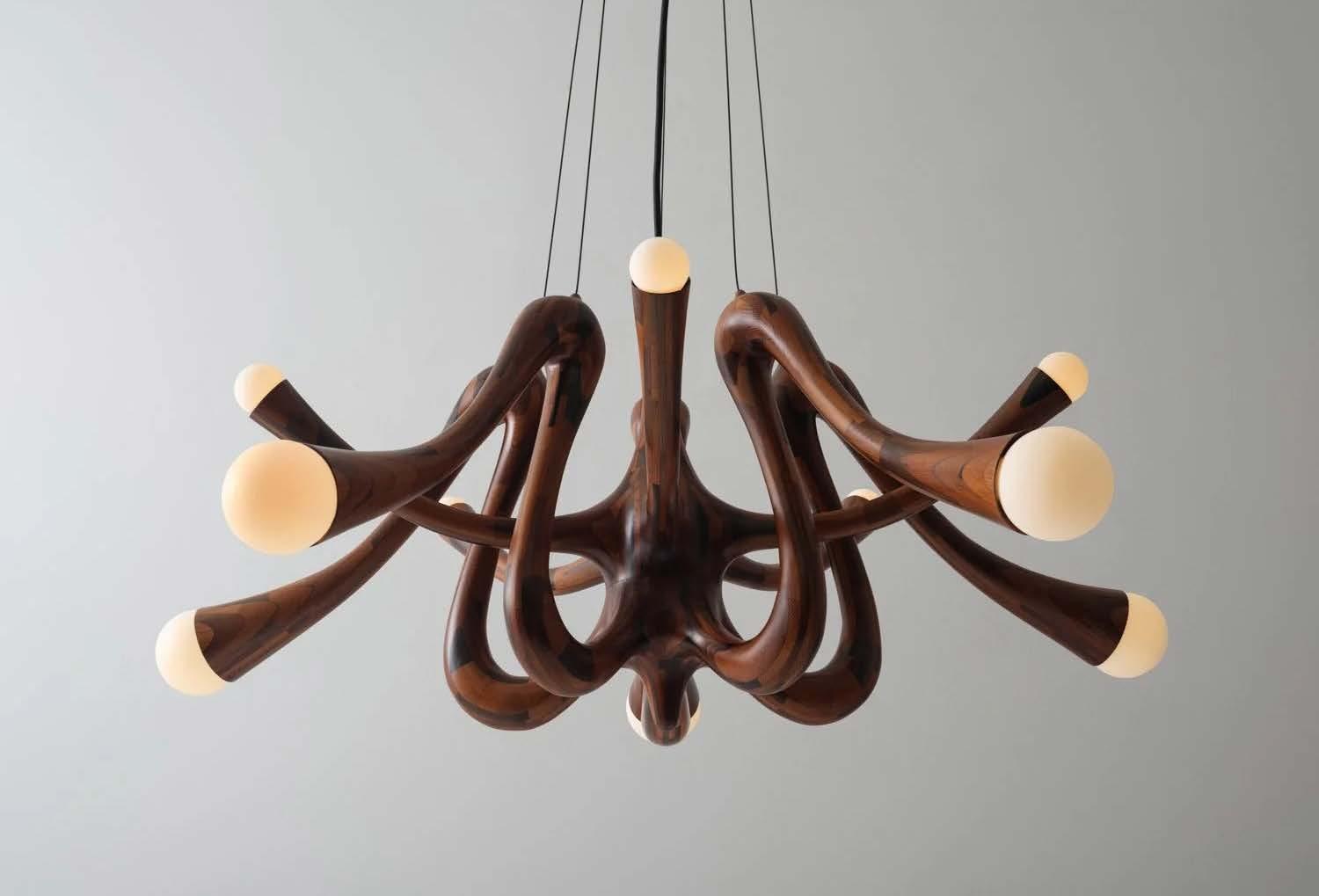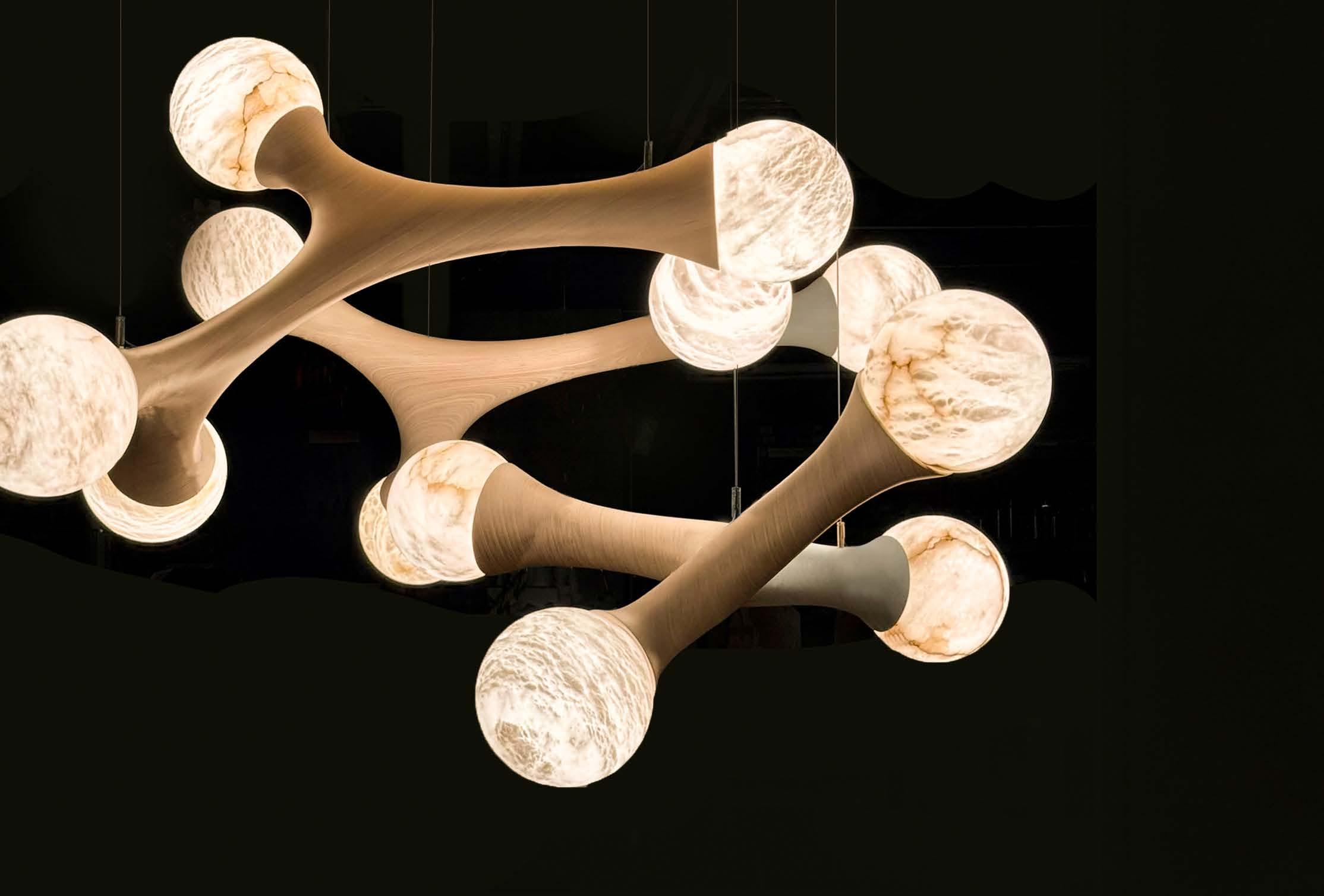 Ezra has also extended his practice into lighting design, applying the same synthesis of digital modeling and material exploration to illuminated works. His lighting pieces often integrate sculptural form with advanced fabrication techniques, resulting in objects that not only emit light but also embody the layered, dynamic qualities of his larger body of work.