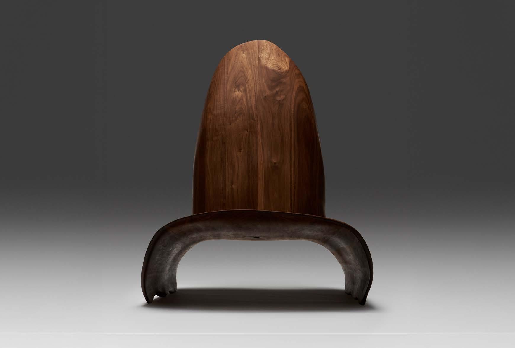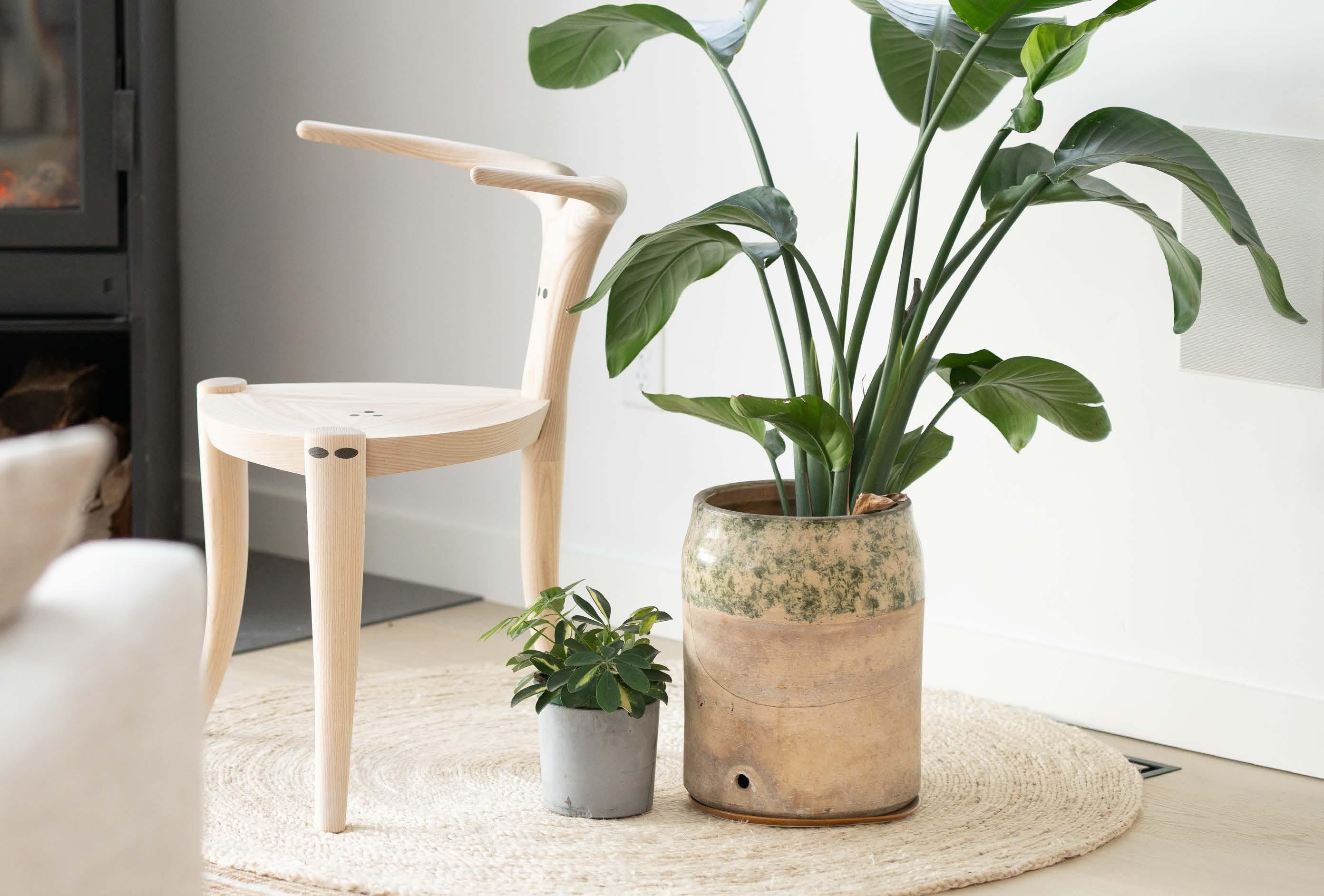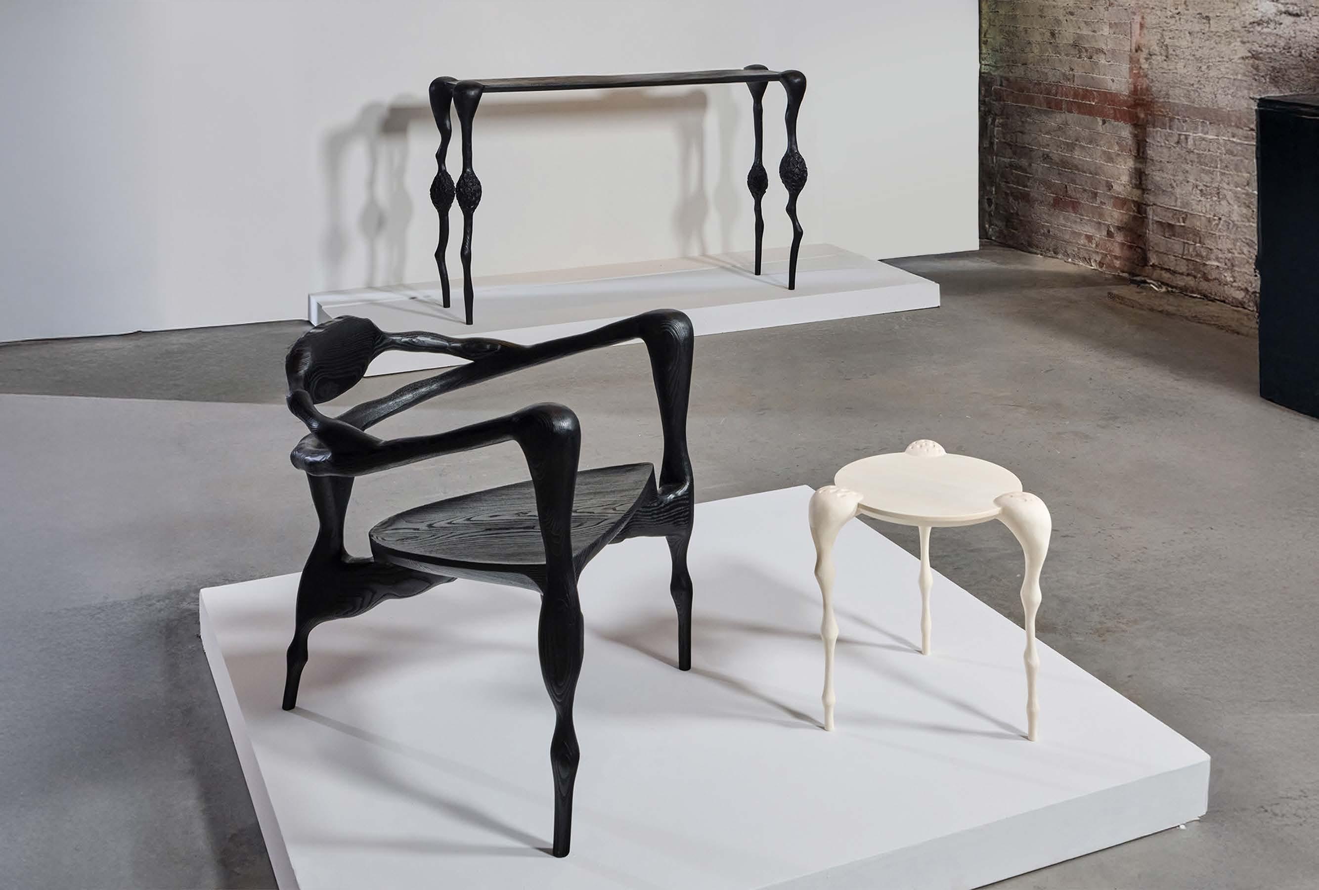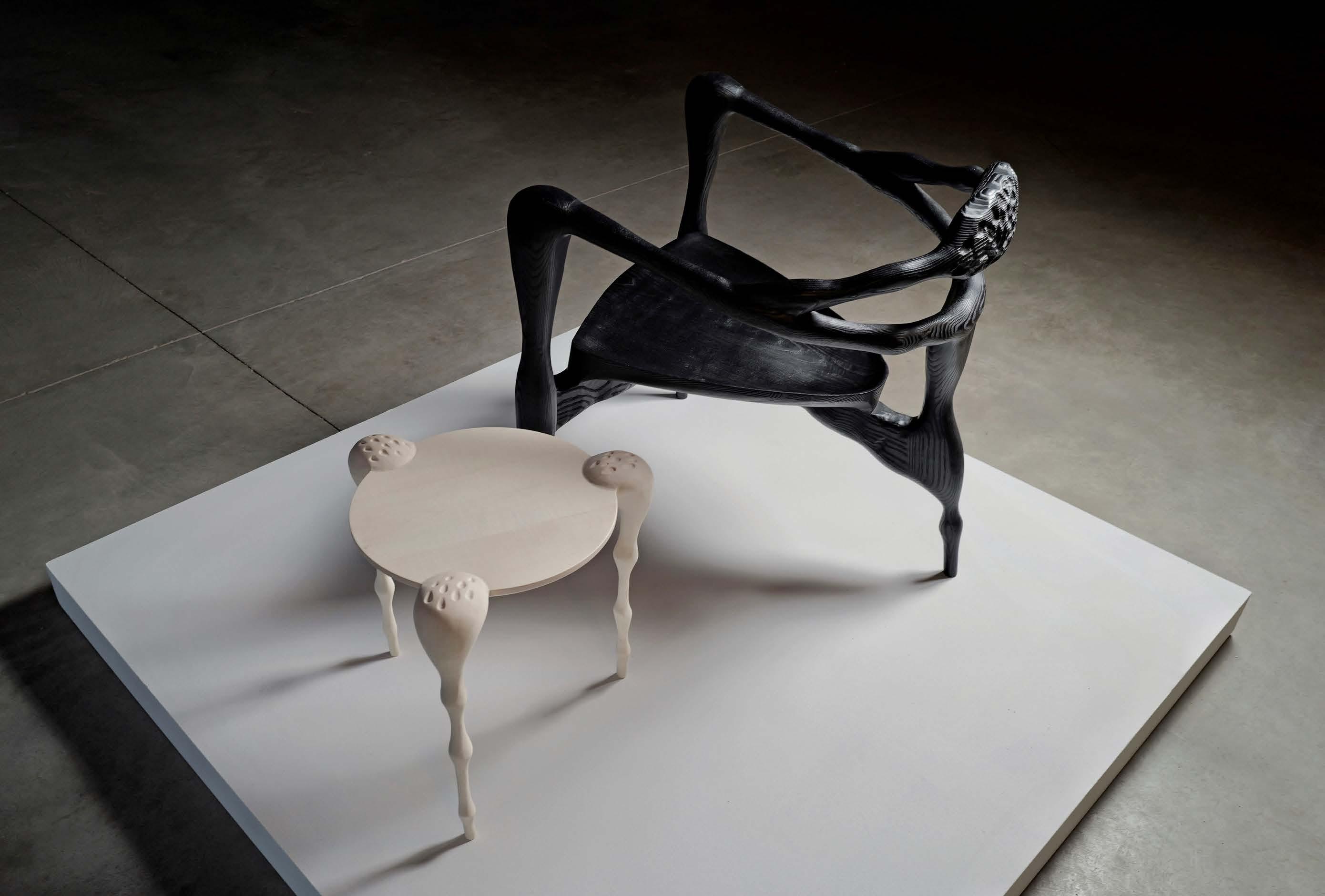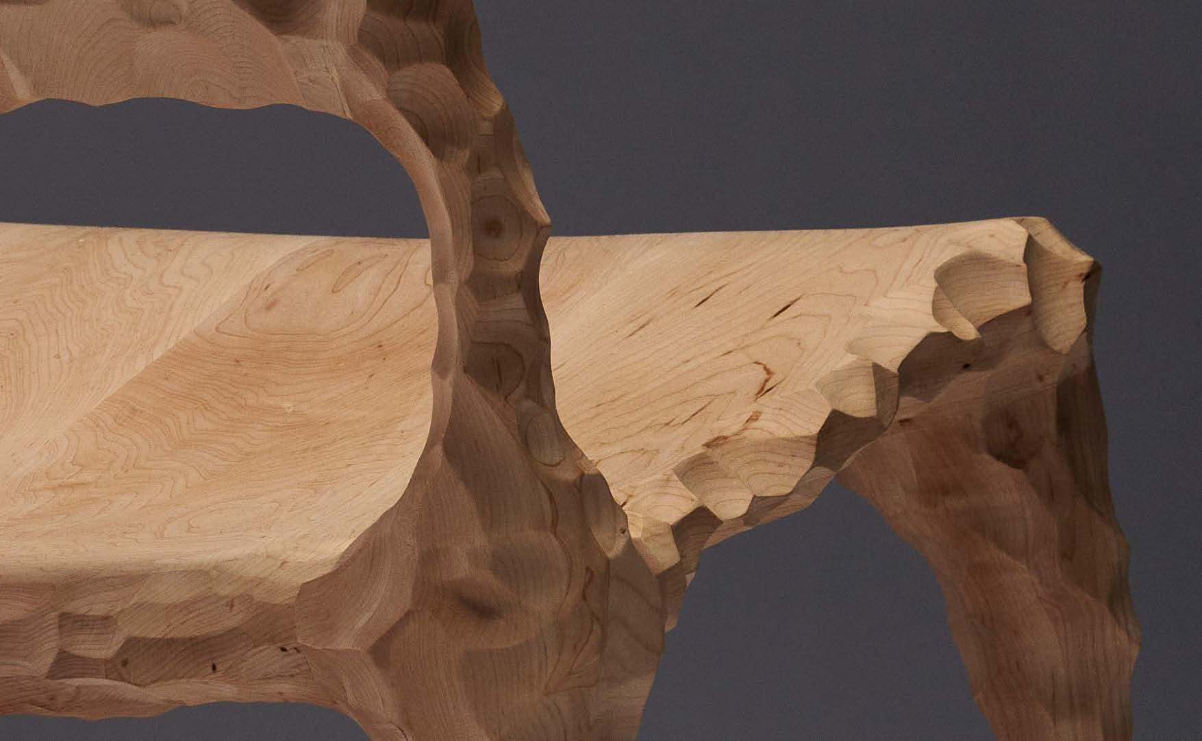 Sofia’s carving process is very organic, working with power carving tools such as angle grinders, down to finer hand tools, referencing sketches throughout. This allows her to create the forms intuitively, and react to the wood as it reacts to the processes and allow the grain to inform the shape. Sofia subjects her work to extreme conditions when finishing; chemical bleaching Sycamore to achieve a bone white colour, and scorching Ash to create a blackened, highly textured finish. Working in this way allows the forms to be material led. As she carves, Sofia exposesand focuses on the natural grain in the wood, using this to inform and accentuate the shape. She wants to evoke the feeling that these pieces were once living, appearing to come from one piece by allowing the grain to inform the shape.