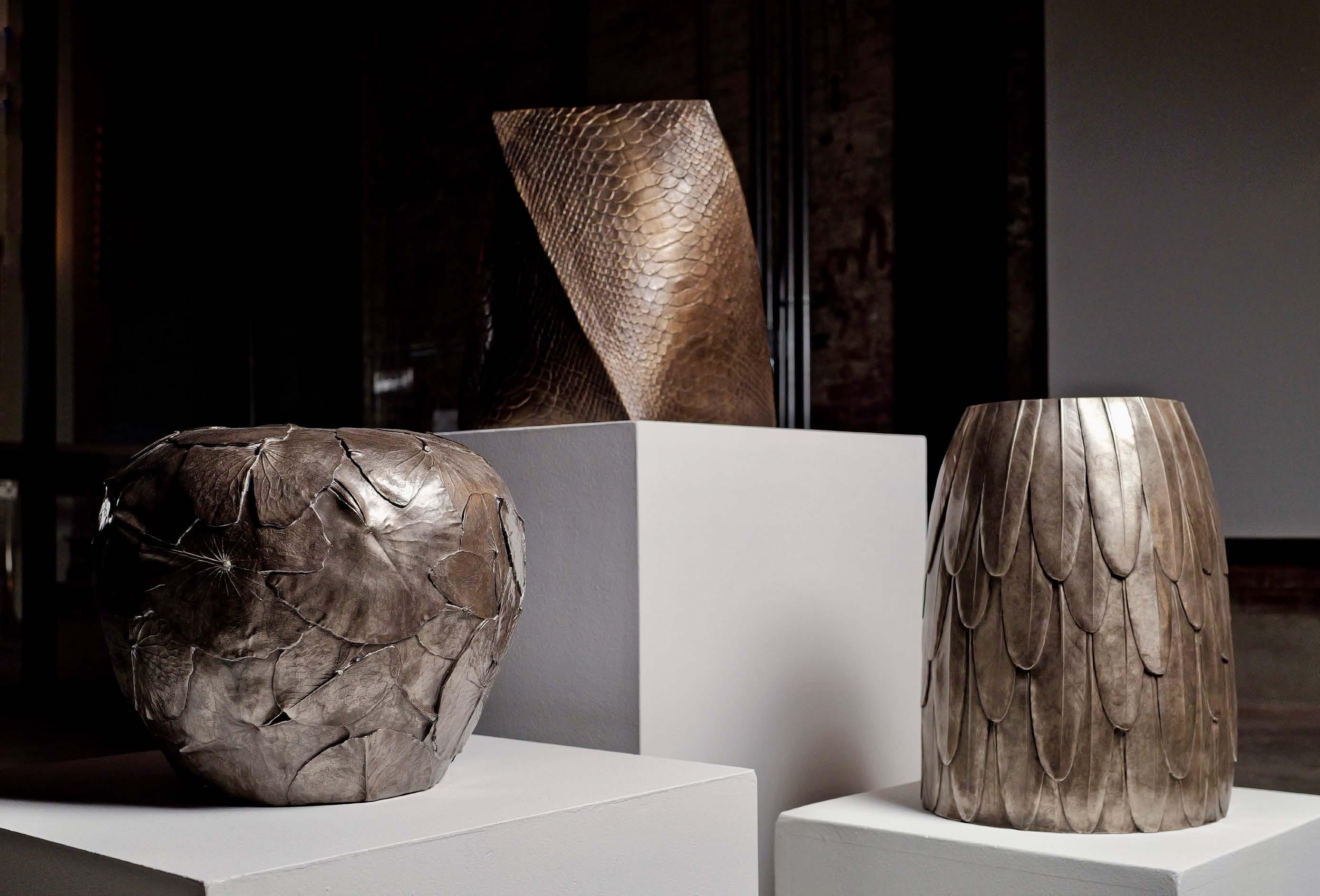 Her process includes mold making, wax sculpting, and lostwax casting. Since 2014, her work has been exhibited and collected worldwide.