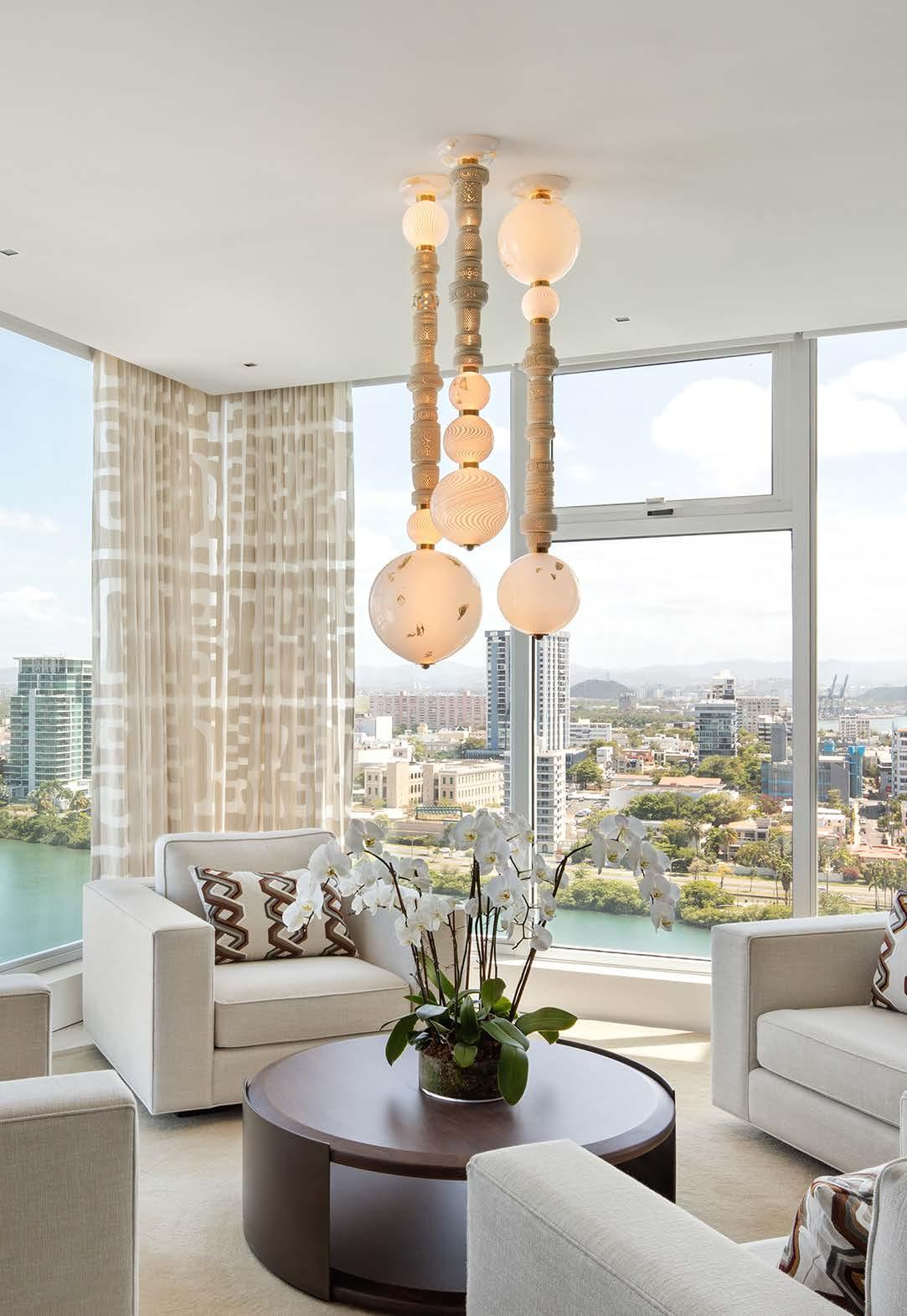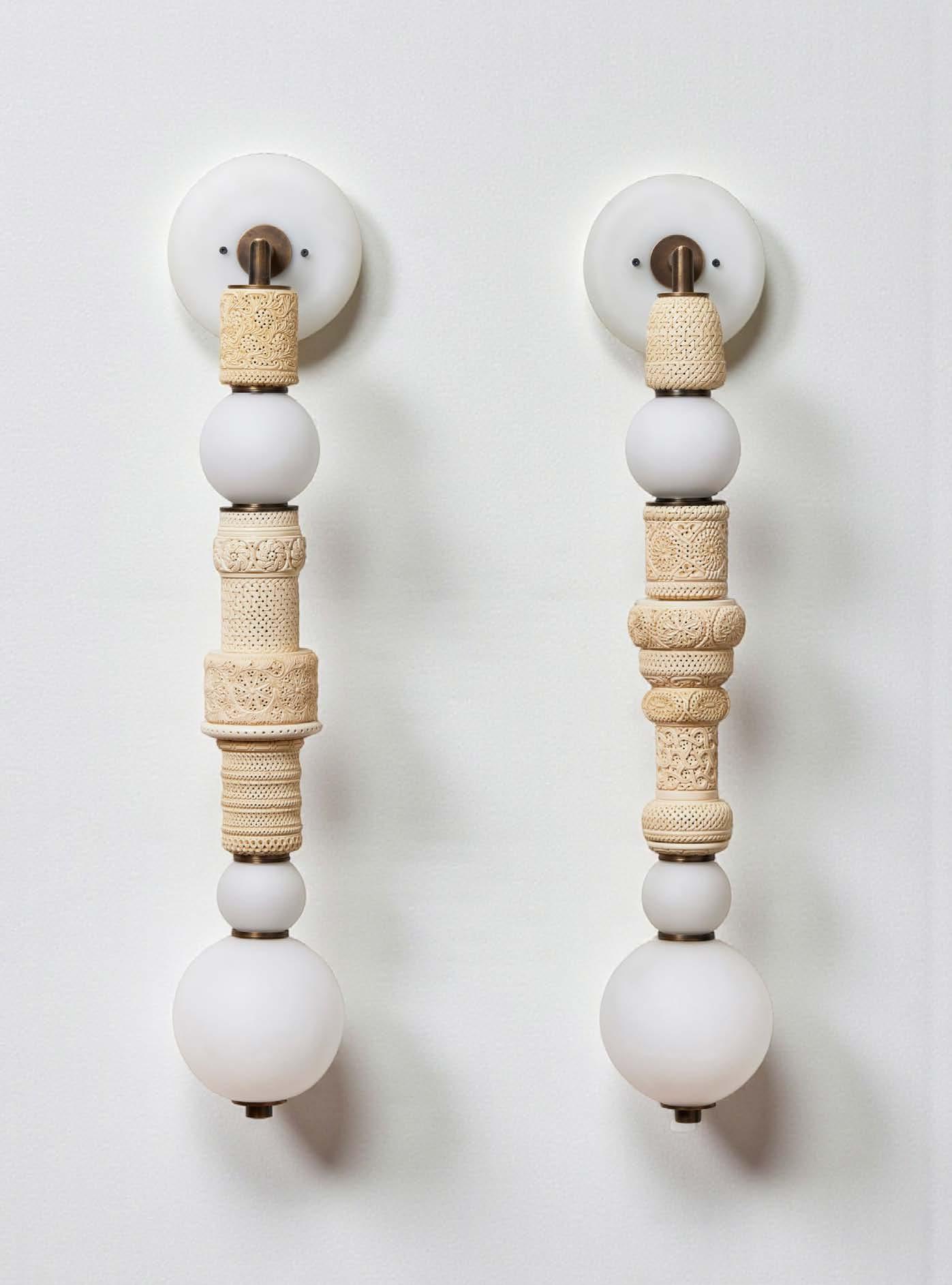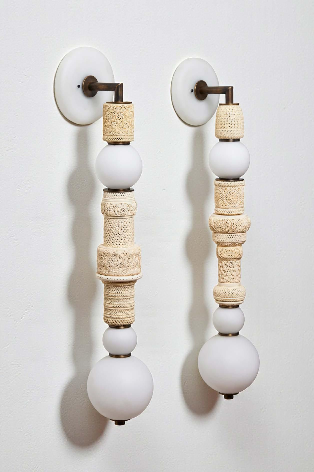 Inspired by the architecture and culture of her native Istanbul, Feyza Kemahlioglu has created a unique lighting collection entitled Pillars of Meerschaum. Meerschaum (German for “seafoam”) is a soft white clay mineral found mainly in Eskisehir, a small city in central Turkey. Master Turkish craftsman carve the Meerschaum with intricate patterns and perforations to diffuse the light. The stone is then combined with handblown glass and brass elements created in New York. The blown glass compliments the detailing of the Meerschaum with the addition of delicate textures made with cane and gold leaf.