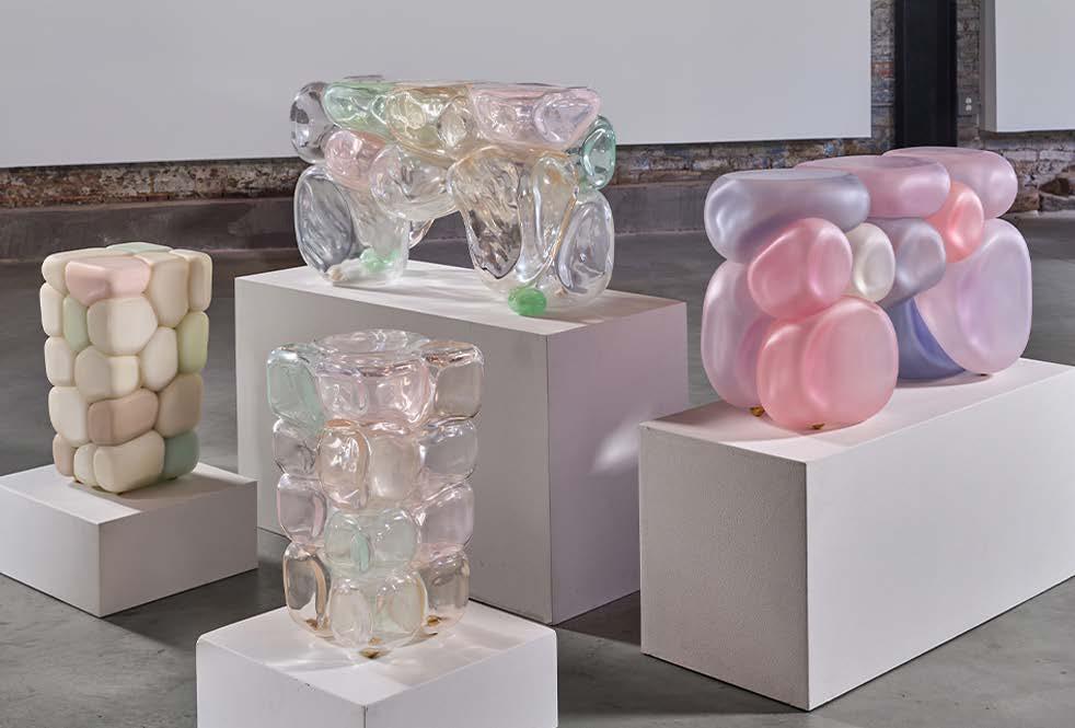 Baumann’s acclaimed Boo series epitomizes his artistry, featuring tables and seating crafted from meticulously stacked resin bubbles. These organic forms, influenced by chance yet guided by his thoughtful frameworks, glow with a gentle translucency that imparts a sense of fluidity and elegance. Resting atop polished brass feet, the pieces invite touch with their smooth, matte surfaces, striking a harmonious balance between structure and spontaneity.