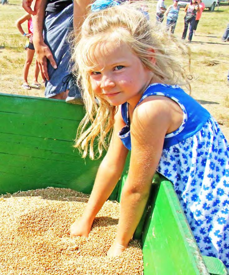 A young girl had fun burying her hands in freshly-threshed wheat, in the grain wagon set up at the threshing demonstration at Midale on Saturday. The demonstration showed how harvesting used to be done 80 or 90 years ago in the southeast region.