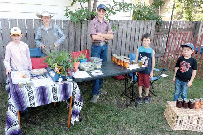 Two Tyvan area farm families brought home-made items for the popup market held as part of Fillmore’s Festival in the Park last Thursday. From left are Macie, Kipton and Tanner Kyle, and at right are Cutler and Colt Buckingham. The items they made, including pies, preserved vegetables, flowers, hand-drawn cards and tea, were on display for sale at the market, held in Lanny B Park on McCullough Street in Fillmore.