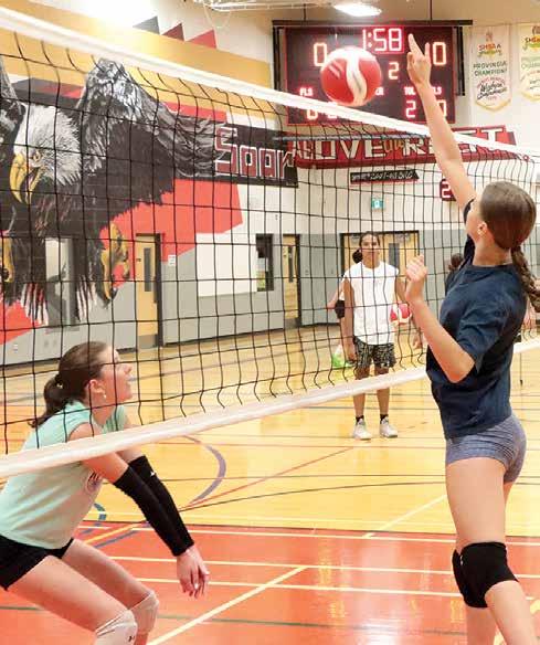 A junior high volleyball player tipped the ball to the other side, during a three-on-three drill where the players tried to keep the ball in the air back and forth without touching the floor for as long as they could. This was part of a three-day volleyball camp held Aug. 20-22 at the WCS Eagle gym.