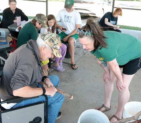 Greg Mallett had some tips for Regan Lanning on carving a willow walking stick, in a workshop he held on Sunday at the River Park gazebo. Mallett provided the willow branches and