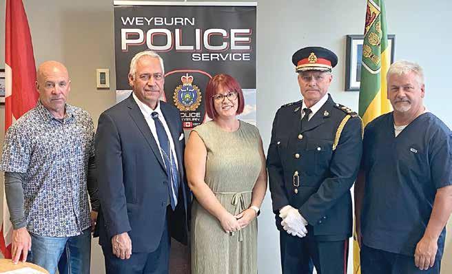 Members of the Weyburn Board of Police Commissioners attended the ceremony, swearing in Brent VanDeSype as Weyburn’s new police chief last Thursday. From left are Barclay Charlton, Mayor Marcel Roy, Krista Hubic, Brent VanDeSype, and John Corrigan. Missing was board member Ron McCormick.