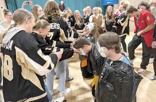 Four Weyburn Gold Wings players got to pie four players from Weyburn Comp Eagles football team, after the girls beat the guys in “Minute to Win It” contests and in the air band competition at Communithon on Friday night. The pieing took place after the telethon went off the air.