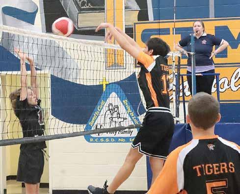 St. Michael Tigers player, Ken, pushed the ball back over to Arcola, during a boys volleyball tournament at St. Michael School on Saturday. The Boys team won this match, and went on to win the tournament. The Girls A team will be hosting their tournament at St. Michael School this weekend.