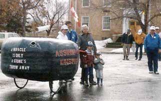 Monroe (centre, wearing a red plaid shirt) guided a Friends of St. Victor Petroglyphs tour, and looked at the petroglyphs on