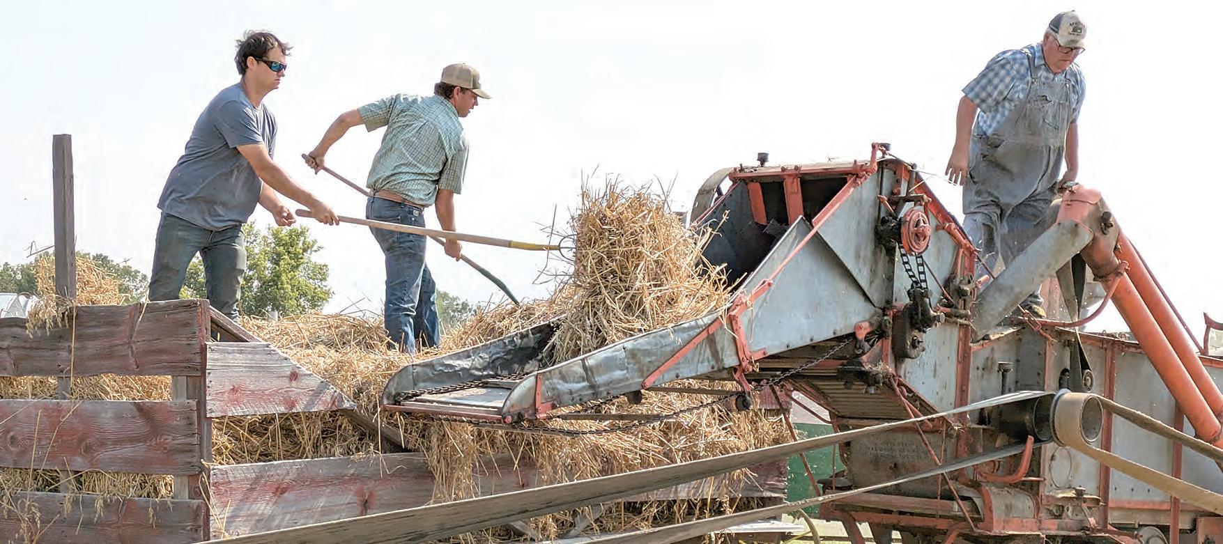 grain the old-fashioned way Glen Stomp, at right, kept a close eye on the workings of the antique threshing machine, as two volunteers used hay forks to