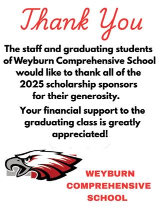 Violet Delrose Moore English Scholarship, $500, was presented to Amy Swayze. Violet Delrose Moore Memorial, $500, was presented to Hayden Black. Weyburn Chamber of Commerce, $500, was presented to Falon Jordens. WCS Citizenship Award, $500, was presented to Pauleen Malpaya. WCS Custodians Scholarship, $500, was presented to Phil Sony. WCS Konica Minolta Award, $500, was presented to Nicole Malana. WCS Leadership Award, $1,000, was presented to Whitney Lanz-McIntyre. WCS Scholarship, $1,000, was presented to Jyllian Payak.