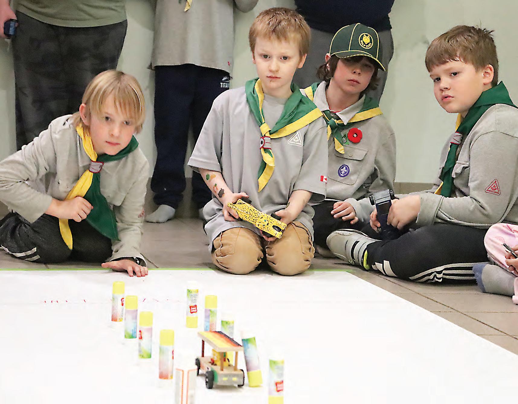 Lachlan Zyla, left, from the Fifth Weyburn Scouts, and Joshua Moggey, from the Moose Jaw Kinsmen Scouts, competed in a difficult mat trial during a Kub Kar Rally at Grace United Church on March 21.
