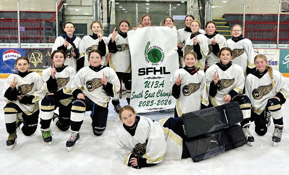 The U13 Canadian Tire Gold Wings captured the U13 Southeast Championship on March 12, completing an undefeated season. The team consistently demonstrated strong teamwork, resilience, and determination throughout the year. With the southeast title secured, the Gold Wings now turn their attention to the final championship, where they will face the northeast champions, the Delisle Bruins. They played game one one March 20, with game two set for Thursday, March 26 and game three on Sunday, March 29. Back row, l-r, Adella McEwen, Peyton Leblanc, Keira Jackson, Sarra Giroux, Adele Perras, Jayda Weichel, Payton Bell, Brady Nielsen and Rayna Taylor. Middle row, l-r, Adalynn Lockert, Victoria Gill, Myla Patterson, Emery Gall, Brooklyn Bell and Bailey Schaeffer. Front row Heidi Bell. Missing from photo, head coach Karsten Nielsen, assistant coach Janelle Jackson, assistant coach Jeff Schaeffer, assistant coach Kristy Gall and Blake Coulter. Photo submitted