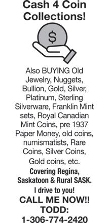 FOR SALE: 48” brass bed head & foot; Custom made massage/physio therapy table, vinyl covered; USA 50 State quarters 1999, mint proof set, uncirculated; Official 1986 Expo Entrance medallion uncirculated; Fax/photo copy & phone, Brother, hardly used; Apple gift card - $100; Electric snow shovel. Call 639-9407700.