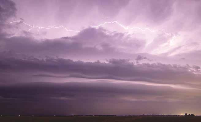 A thunderstorm turned the sky purple, with rolling clouds and flashes of light. September weather has been warmer than normal, with above-normal precipitation.