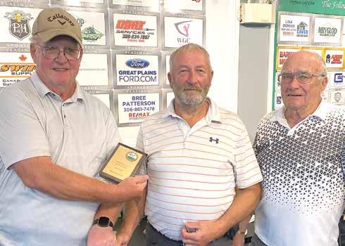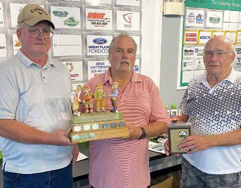 The Senior Men’s Golf League presented year-end awards during the windup on September 11. Pictured at top: Executive Members Don McKinnon, left, and George McLeod, right, presented the 2025 Masters plaque to Dale Ruckaber. At bottom: Don Ruckaber, centre, received the Overall Senior Men’s Champion trophy from Executive Members Don McKinnon and George McLeod.