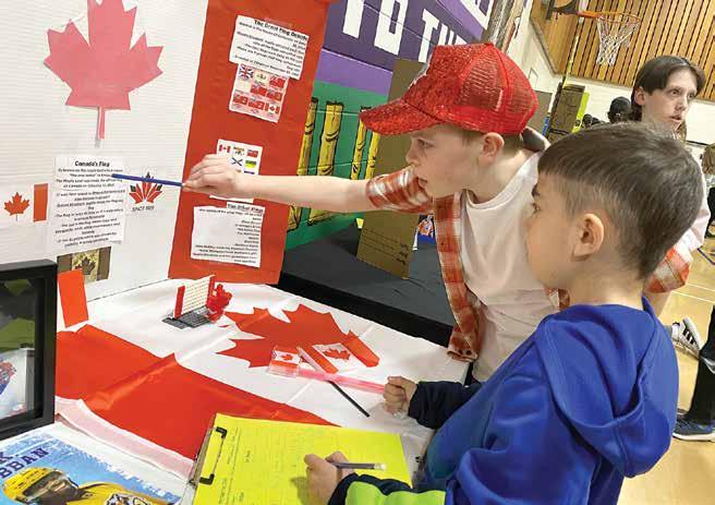 Grade 6 student, Huntley, points out Canadian Flag acts to Grade 4 student, Gleb, and answers a few of his questions about the display. A Heritage Fair was held by Grade 4 to 6 students at Assiniboia Park Elementary on February 13.