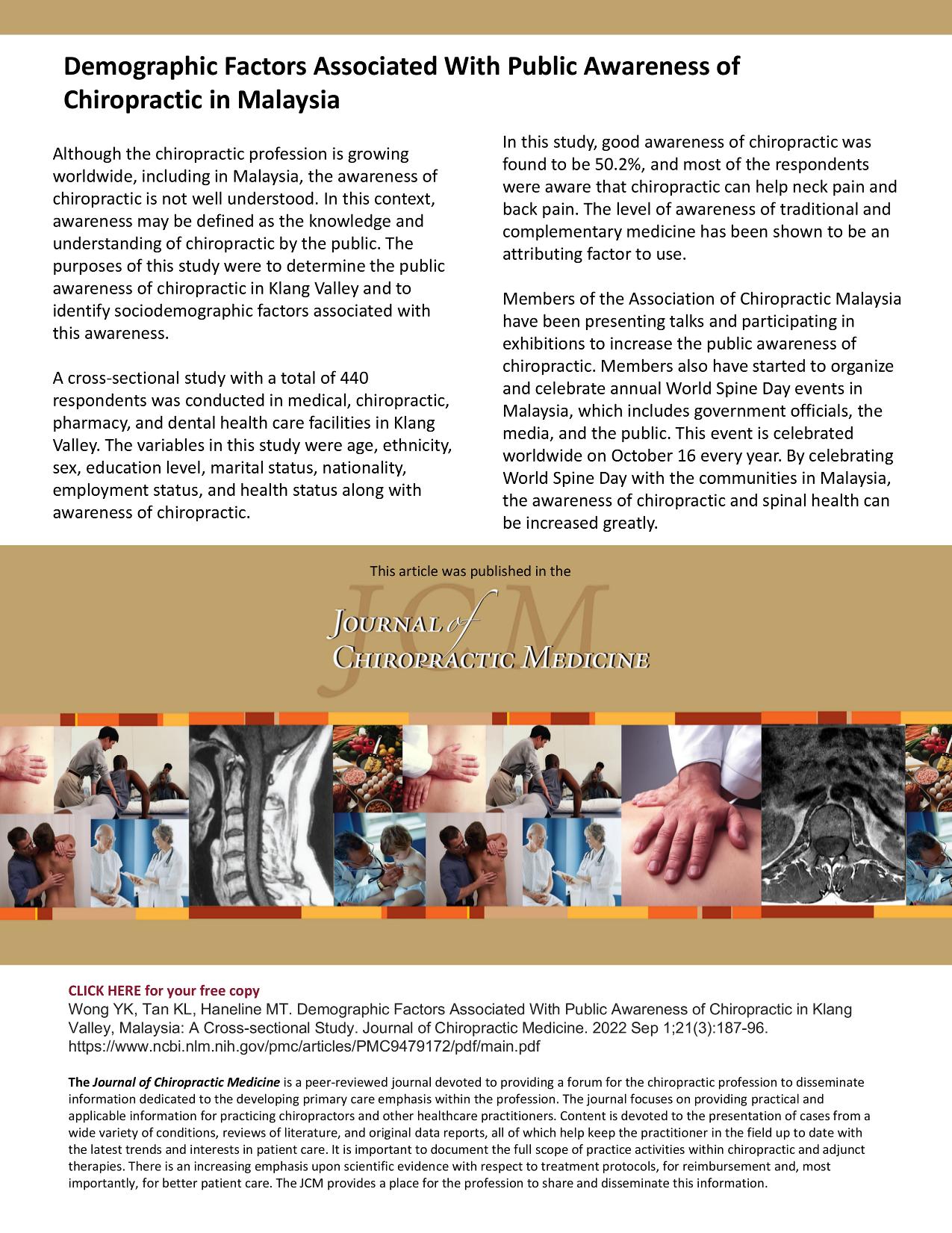 As chiropractors, we know how vital spinal health is to a person?s overall well-being For almost 130 years, our whole-person approach has focused on analyzing structure and function and optimizing the neuromusculoskeletal system Attitudes and beliefs during this time have often meant going it alone, carving out our niche in the healthcare environment.