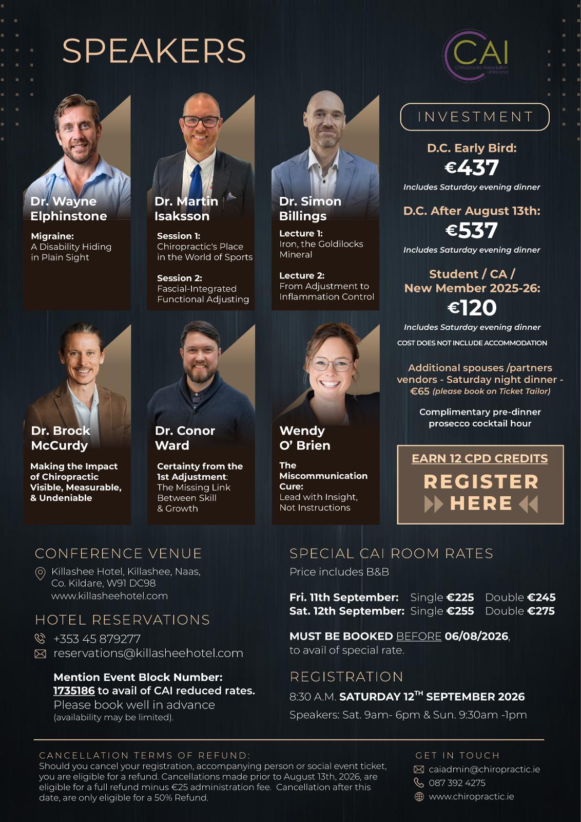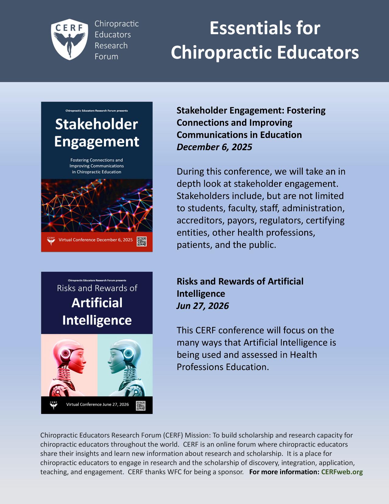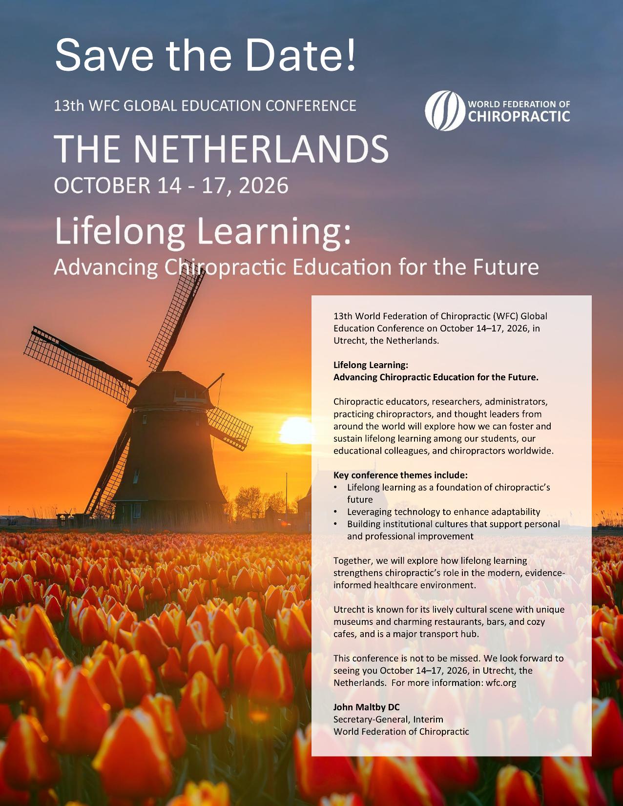 With that in mind, I am pleased to highlight the upcoming WFC Global Educat ion Conference, taking place in Utrecht from October 14th-17th This important gathering will bring together chiropractic leaders, educators, researchers, students, and practitioners from across the globe It will be a valuable opportunity to learn from experts, exchange ideas, and strengthen the collaborative networks that are so vital to our continued growth and success Please mark your calendars and join us for this extraordinary event!