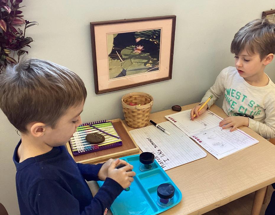We have pets. We get to take care of Hoagie, our snake, and Logan, the superworms who have turned into pupas and then beetles. The work is much harder! Stamp Game gets harder because we do harder problems like multiplication and division. There’s work I never saw before like Subtraction Strip Board. Now I’m doing Bead Houses. We add up to a number in a lot of different ways: 6 is 6+0, 0+6, 1+5, 5+1, 4+2, 2+4, 3+3. I did 1, 2, 3, 4, 5, 7, and 10. I’ll do 8 next. Every work I do is getting easier and easier each time because I’m practicing. The more I do it, it gets easier.
