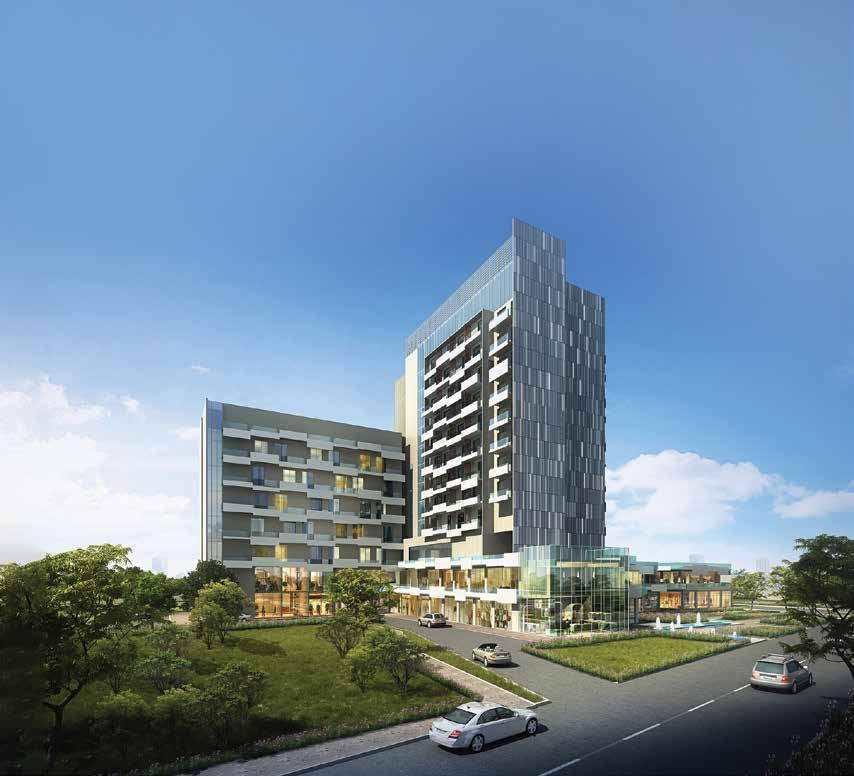 Bansal Complex at Komapally, Hyderabad. Combination of glass, HPL and Walls: The façade’s deep recesses, vertical fins, and shaded balconies make it ideal for Hyderabad’s hot climate. It minimizes heat gain, maximizes natural light, and enhances thermal comfort through passive design suited for intense sun and high temperatures