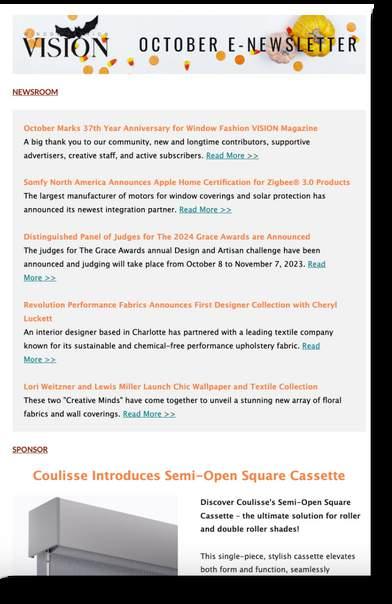 We deliver impact with window treatment industry professionals. At VISION, you can reach qualified buyers who are subscribing to Window Fashion VISION magazine, digital newsletters, and product information news!